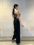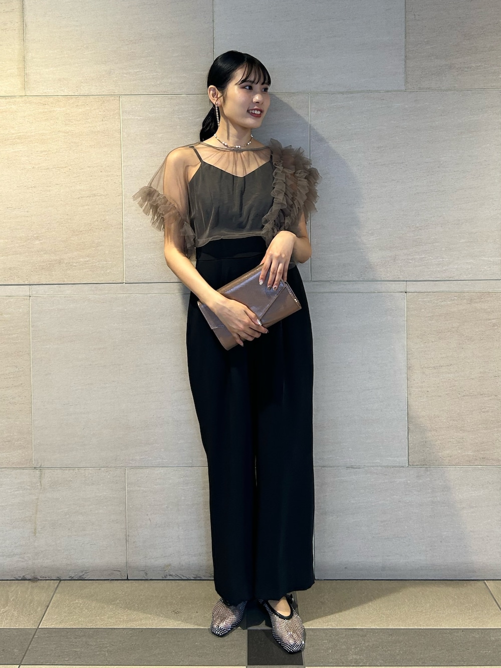 【Dress】 茶色×黒の組み合わせが大人可愛いWEB限定のカラー。 二の腕カバーができるアシンメトリーのチュールデザインで華やかさと上品さをプラス♡ ドレス内側の腰あたりにあるボタンでゆったりさや、肩紐で長さを変えていただけます◎ ウエストは切り替えしでキュッと締まって見えますが、パンツ部分がワイドなので細見えしながら体型カバーができます! 1枚あると何年も着ていただけるデザインです!♡ (165cmでLサイズ着用。Mサイズと着丈は同じです。) 【Bag】 ドレスを扱うラグナムーンならではの程良い光沢感のあるラメバッグ。 光の下でもギラギラしすぎないので、どんなデザインや色のドレスにも合わせやすいアイテムです! 付属チェーンをつけると、クラッチ以外にも長さを変えて持っていただけます。 中に袱紗もついているので、荷物を最小限にまとめたい方にもオススメ◎ 【Shoes】 キラキラと光るストーンが可愛いパンプス。 とにかくキラキラと足元が一気に華やかになるので、オケージョンシーンに特にオススメの一足♡ 黒やグレーなど少し暗めのドレスに合わせて、アクセントにしていただくのも!◎ 形も凄くシンプルなので、素足だけでなく靴下を履いてデイリー使いもできます! 凄く柔らかい素材なので自分の足に沿ってフィットしてくれます。