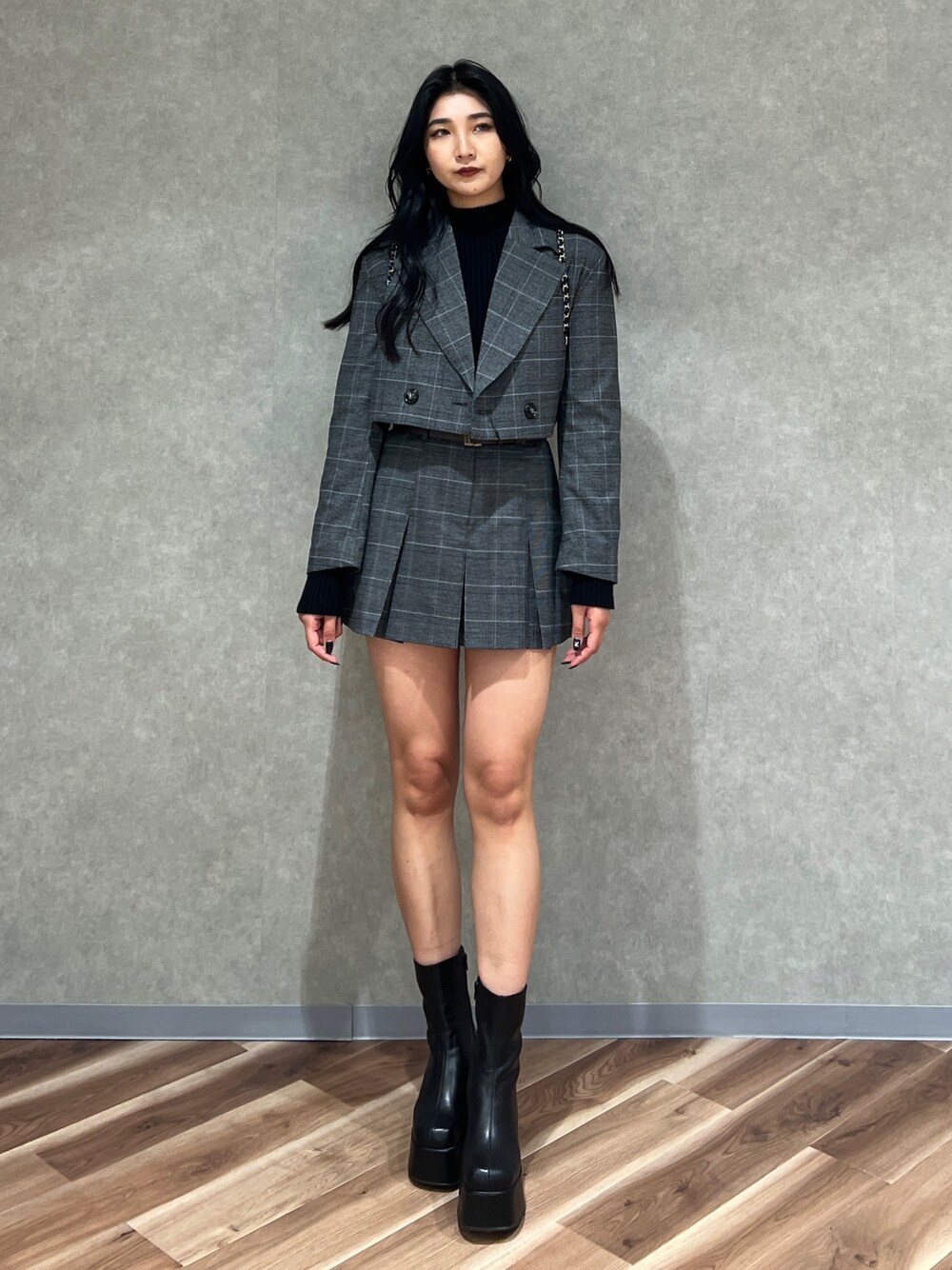 永田真弓(EMODA)のテーラードジャケット「ショートクロップジャケット」を使ったコーディネート
