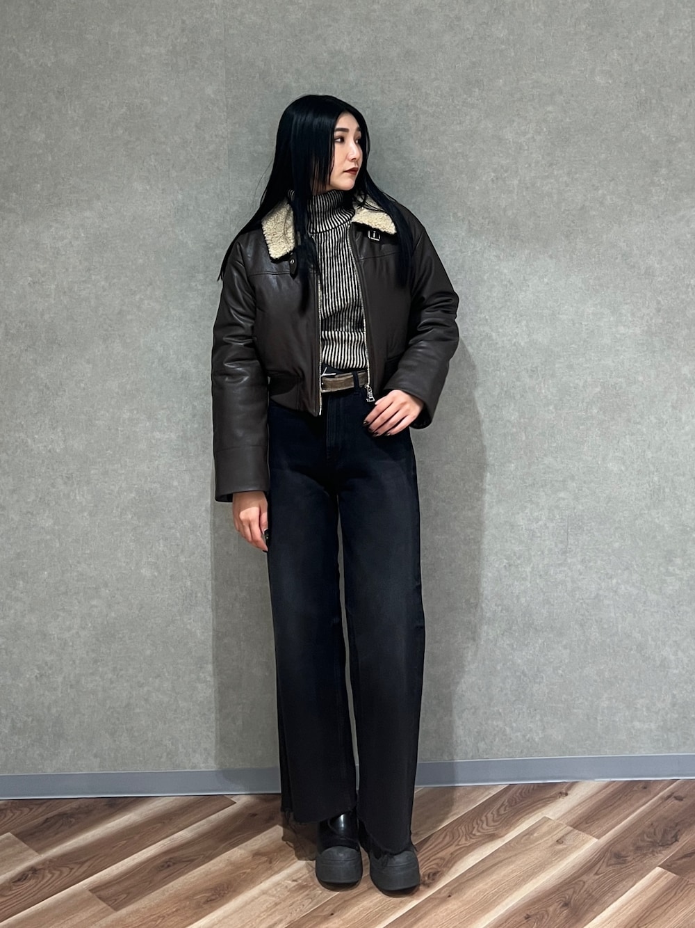 【トップス】 店頭でも人気のニット🧶 黒色の縦の網目が可愛い〜しモード感を 出してくれます!!生地は厚めなので、今の時期ニット一枚で着ることをおすすめします!首詰まってる苦手の方はネックのところを半分に折っていただくと、骨格ストレートの方でも首が見えてスッキリします よ私も折ってます! 【パンツ】 8割足になるワイドデニム‼︎ 漆黒に、ハイライトがうっすら入ってるビンテージ感のあるデニムです!ウエストヒップがルーズすぎないのでワイドでも美脚効果🔥 【シューズ】 普段26cmでLサイズ ヒールが7.5cmでとても盛れます〜! デニムにも合わせても可愛いし、ワンピとかスカートに合わせても可愛いです! 【アウター】 店頭で人気のアウターです! レザー生地なのに軽くて、中綿が入ってるのでとても暖かい生地です🙆♀️ ショート丈なので脚長効果も抜群✌🏾✌🏾 厚手のニットでも着られるシルエットです!