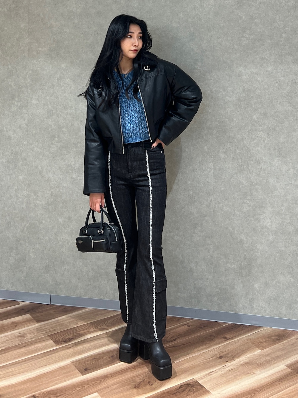 【トップス】 モチモチショートニット!編み目が大きくて、生地はベロア見たいに光沢があります!2wayで着る事ができて、クロスしたデザインと、写真のように並行に着ることができます✨✨お腹出したい時はクロスで、ヒートテック着たい時はまっすぐで!とその時の気分でトップスの雰囲気を変えることができます🤍 【アウター】 店頭で大人気のブルゾン(アウター) レザーなのに、軽くて中綿入ってるので とても暖かいアウターになってます! 首の部分にベルトがあるので立ち上げてきても可愛いです〜♥️ 【パンツ】 センターにラインが入ってて下にポッケがついてるデザインのフレアーパンツ🩳 ロングコート着てもデザインが見えるような作りになってます✨✨ 【シューズ】 ヒール12.2cmです! 足が長く見えるのと、めちゃ去年より軽くて歩きやすいです!!傾斜も少ないので長時間履いても大丈夫です!一足持っとくだけでどんなアイテムにも、どんなコーデにでも相性抜群です◎