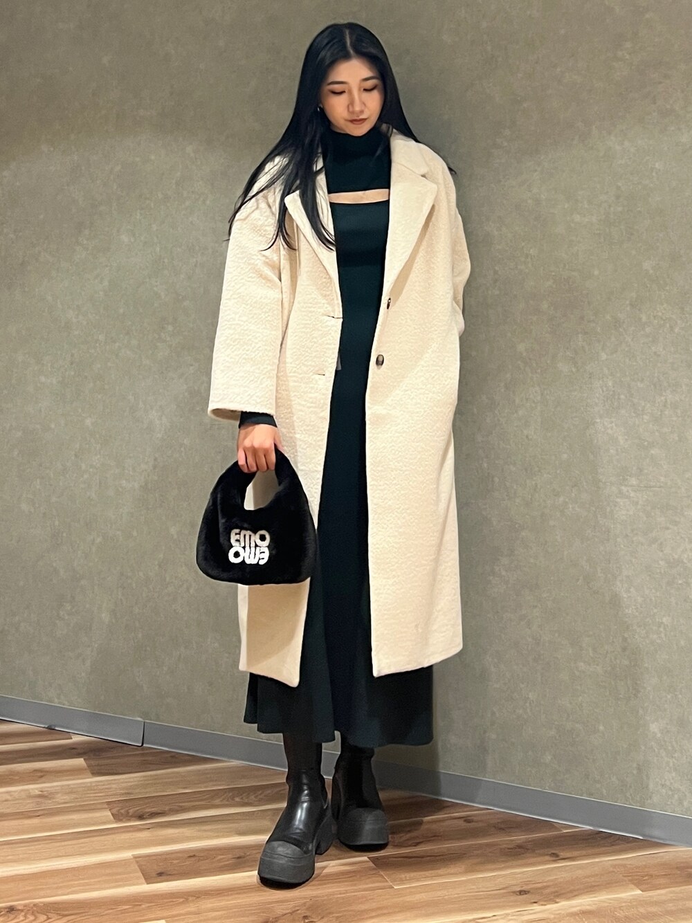 【ワンピース】 Aラインの綺麗めワンピース! 胸元が開いてるデザインで、下着も見えにくい幅です。生地もリブでタイトですが、下に連れて広がるので上品に着られます✌🏾 首元のハイネックも半分くらいの長さなので詰まってるの苦手な人でも着やすいです✨ 【アウター】 冬は一個は持っておきたいロングコート! 厚手の生地なので、真冬でも大活躍🔥 168cmでふくらはぎくらいの長さで着られます! 【シューズ】 普段26cmでLサイズ ヒールが7.5cmでとても盛れます〜! デニムにも合わせても可愛いし、ワンピとかスカートに合わせても可愛いです!
