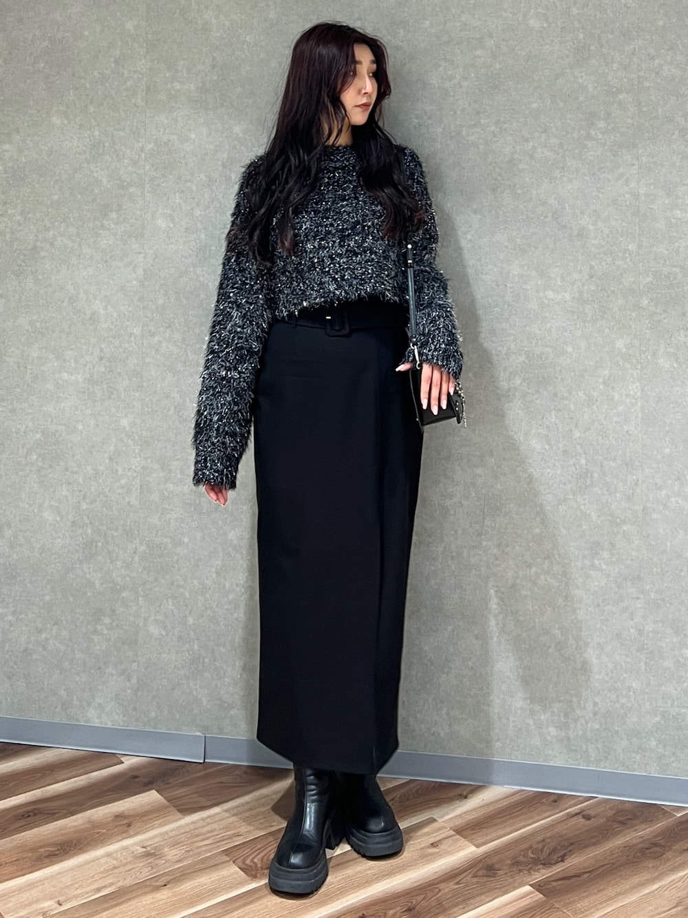 【トップス】 店頭で大人気のキラキラニット! キラキラがチクチクしないので、安心して着られます🙆♀️ 丈感がショートなのに、袖が長めで可愛いです❤️ 【スカート】 ハイウェストスカート!スリットが入ってますが、深すぎないのでとても着やすいです 【ブーツ】 Lサイズ