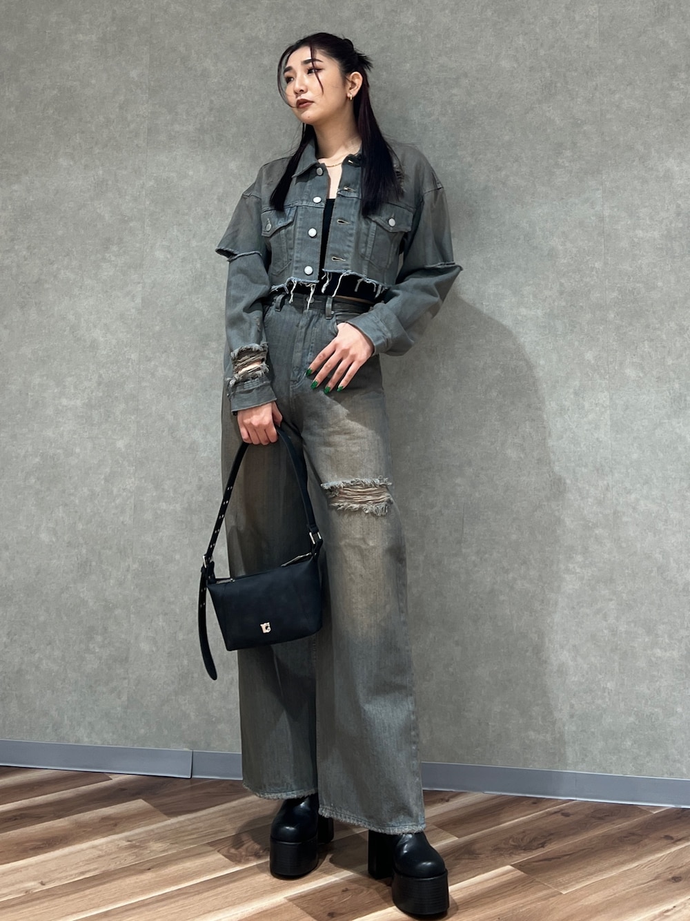 永田真弓(EMODA)のデニムジャケット「Wスリットカットオフデニムジャケット」を使ったコーディネート