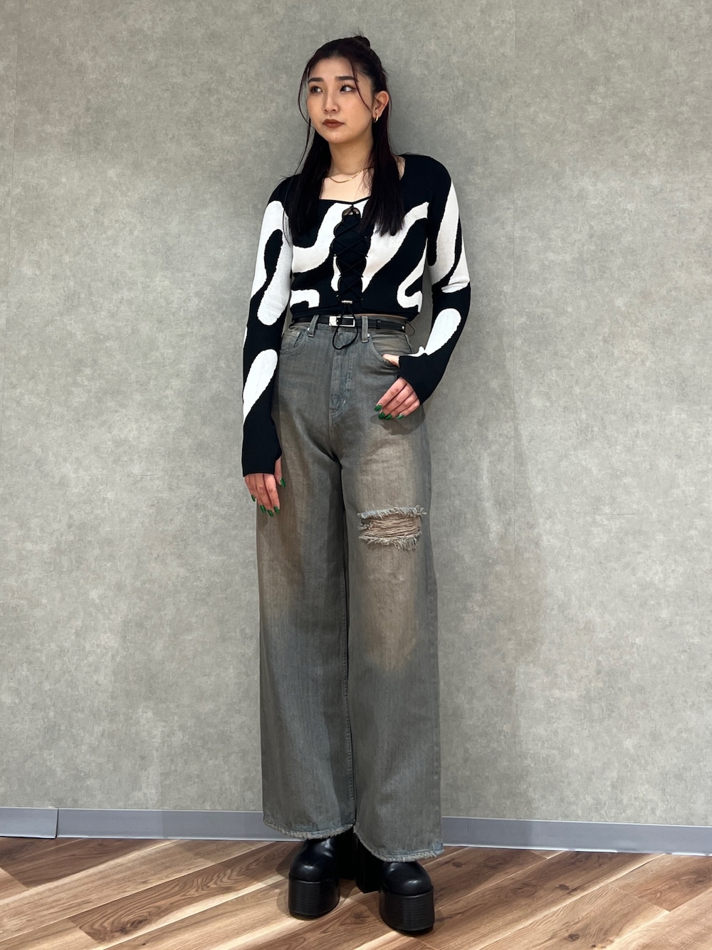 永田真弓(EMODA)のニット/セーター「フロントレースフィットニット」を使ったコーディネート