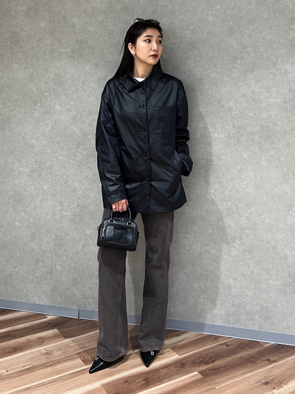 永田真弓(EMODA)のナイロンジャケット「【VEQUM】LEATHER LIKE NYLON JACKET」を使ったコーディネート