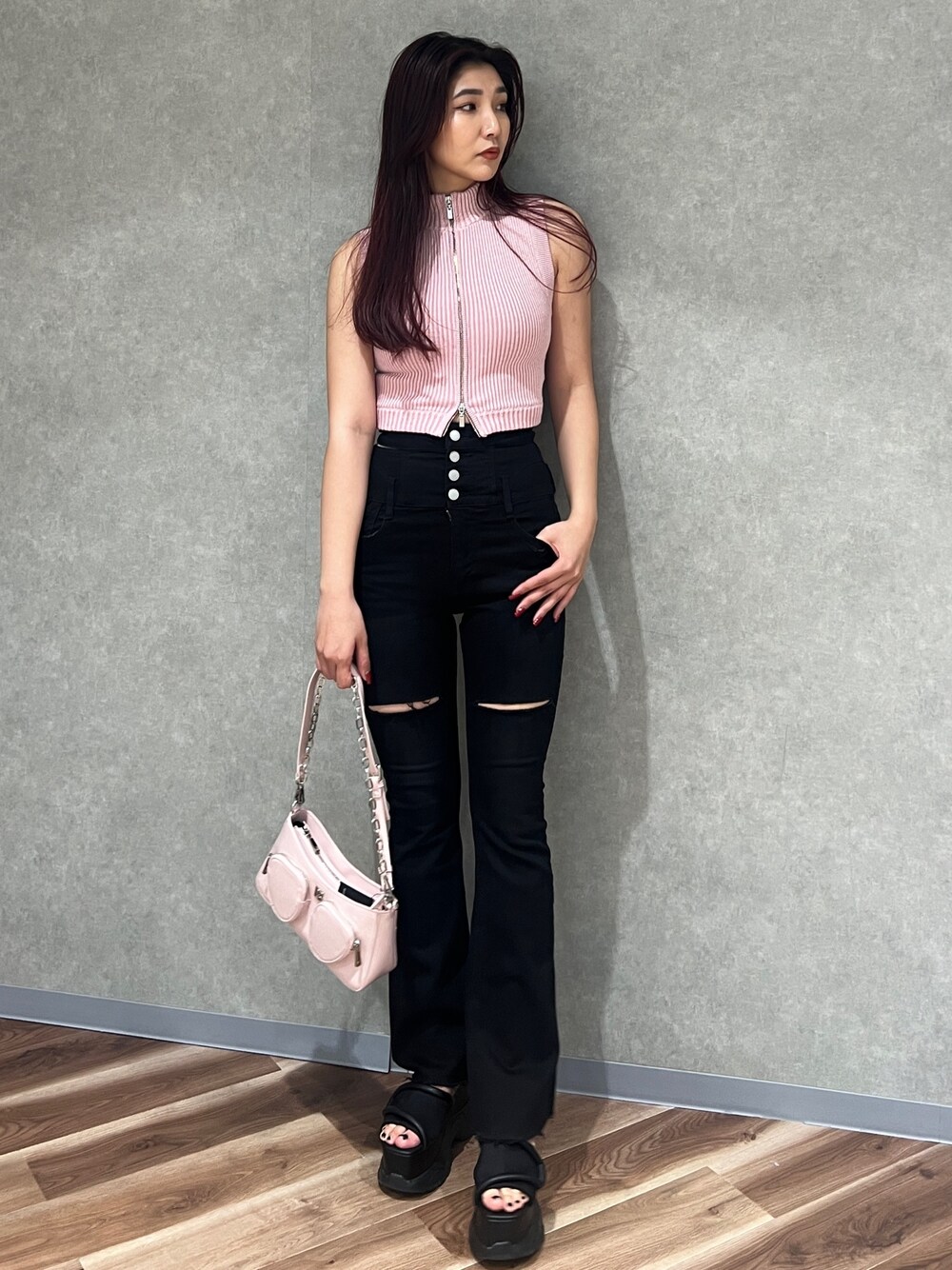 【トップス】 タンクトップのニットトップス🧶 伸縮性があるのでとても着やすいですし、全締めしてもかわいいし首元開けてもかわいいです! 【パンツ】 こちらのフレアーパンツめちゃ伸びます! マイナス5キロに見えます! 切り替えが上にあるので、足が長く見えます! 【シューズ】Lサイズ