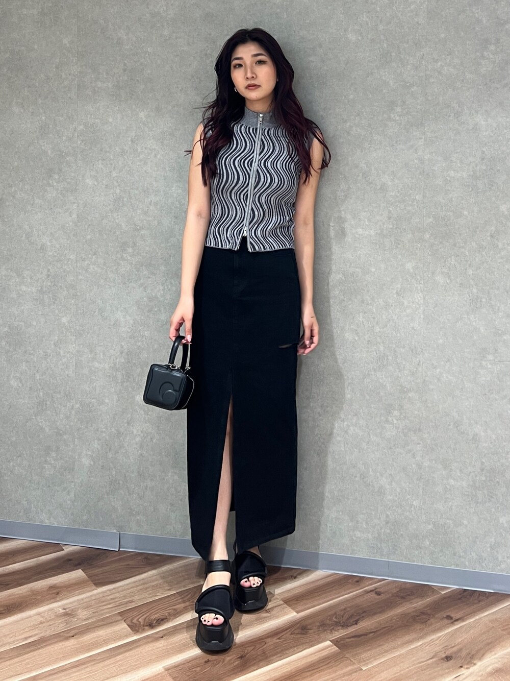 【トップス】 エモダのお姉さんブランドの「VEQUM」 柄がしっかり入ってるのでコーデのワンポイントに!ノースリーブなのに、腕が細く見えるのと脇肉も気にせずに着られます🙆♀️♡ 【スカート】 サイドに切り込みがあるタイトスカートです!ハイウェストなので短めのトップスと合わせるとスタイルが綺麗に見えます👀 【シューズ】 Lサイズ