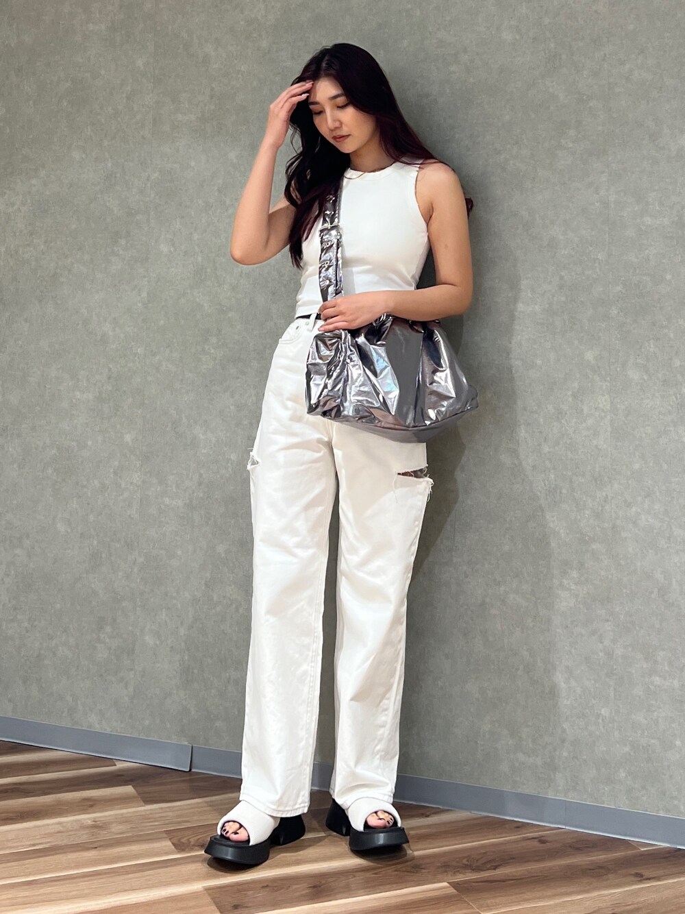 永田真弓(EMODA)のタンクトップ「バックカットハートタンクトップ」を使ったコーディネート