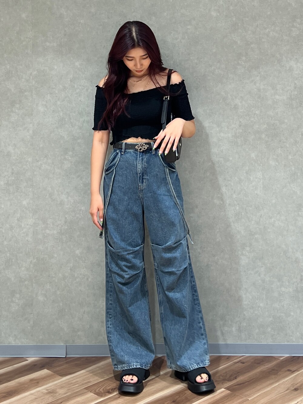 【トップス】 デコルテが綺麗に見えるトップスです🌟 生地感がしっかりしてるので、お胸をキャッチしてくれるのとお腹周りもギャザーなので細く見えます〜! ワイドのデニムでカジュアルに、 綺麗なトップスを合わせることでスタイルアップです! 【パンツ】 ディテールがたくさん付いてるワイドのデニムです!ハイウェストなので足が長く見えます^_^ シンプルなトップスと合わせてあげても可愛いし、今回みたいにデザインがあるアイテムだと個性的になります! 【シューズ】 Lサイズ