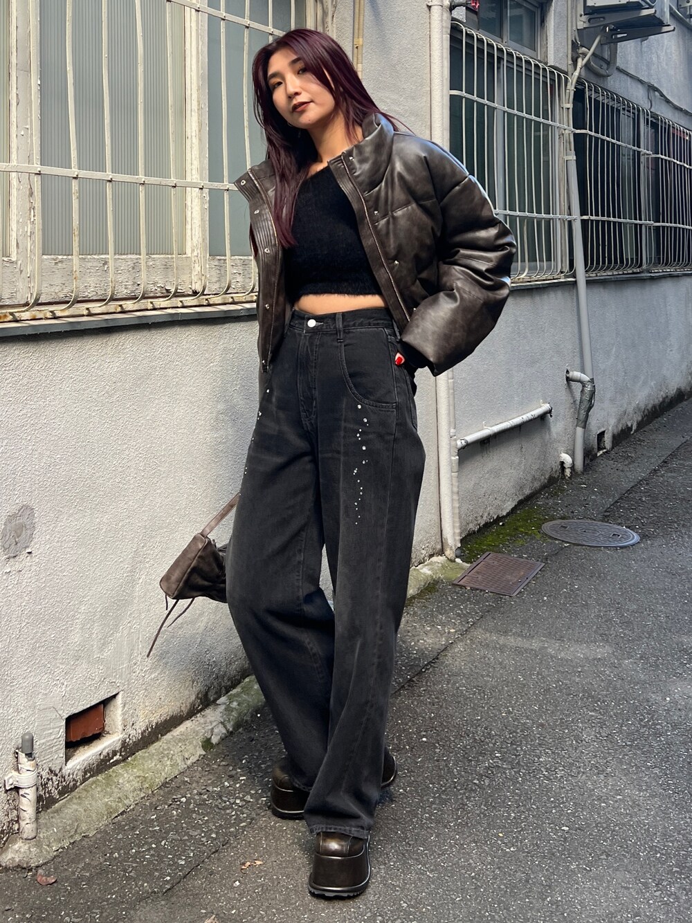 【アウター】 ショート丈のレザーダウンです!❤︎ 中綿がしっかり入ってるので暖かいです☀️ レザーの割に柔らかい生地感なので、 動きやすいですし、厚手なニットと合わせても大丈夫です◎ 【トップス】 アシンメトリーになってるトップスです!❤︎ モケモケの生地が冬ぽいので一枚あるだけで存在感ございます!❤︎ 丈感はショート丈です!❤︎ 【デニム】 8割足になるワイドデニム‼︎ 漆黒に、ハイライトがうっすら入ってるビンテージ感のあるデニムです!ウエストヒップがルーズすぎないのでワイドでも美脚効果🔥トレンドのキラキラがワンポイントで可愛いです⭐︎ 【シューズ】 ヒールが8cmで高低差がないので とても歩きやすいです❤︎ スニーカーと同じ感覚で履いていただけます! 【バック】 トレンドのリボンデザインのバック! こちらも店頭で人気アイテム✨ 長財布や、定期券も入れれる大きさです💨