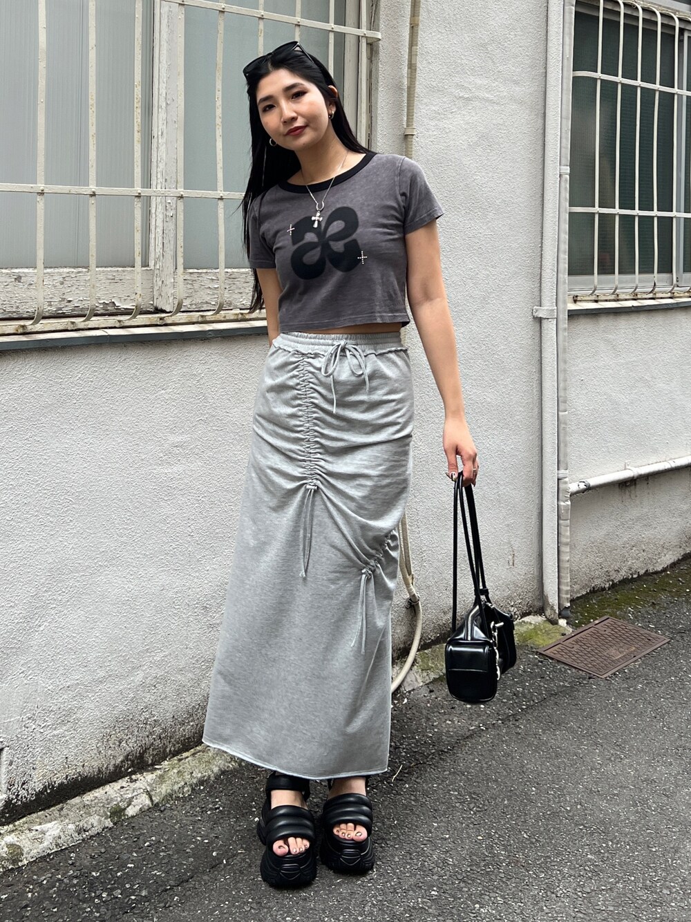 【トップス】 胸元のロゴが可愛いTシャツです! ピタッとしすぎないクロップド丈のTシャツなので、骨格ストレートの方でも着やすいです^_^ 【スカート】 ギャザータイトスカートです! ギャザーが大胆に入ってるので可愛いです(^з^)-☆ウエストゴムなので楽ちんです! 【シューズ】 ヒール10cmです! ぷにぷにの部分が足をキャッチしてくれるので靴づれしずらいのと、歩いてても疲れないです(^з^)-☆ (25.5cm-26cm Lサイズ着用)