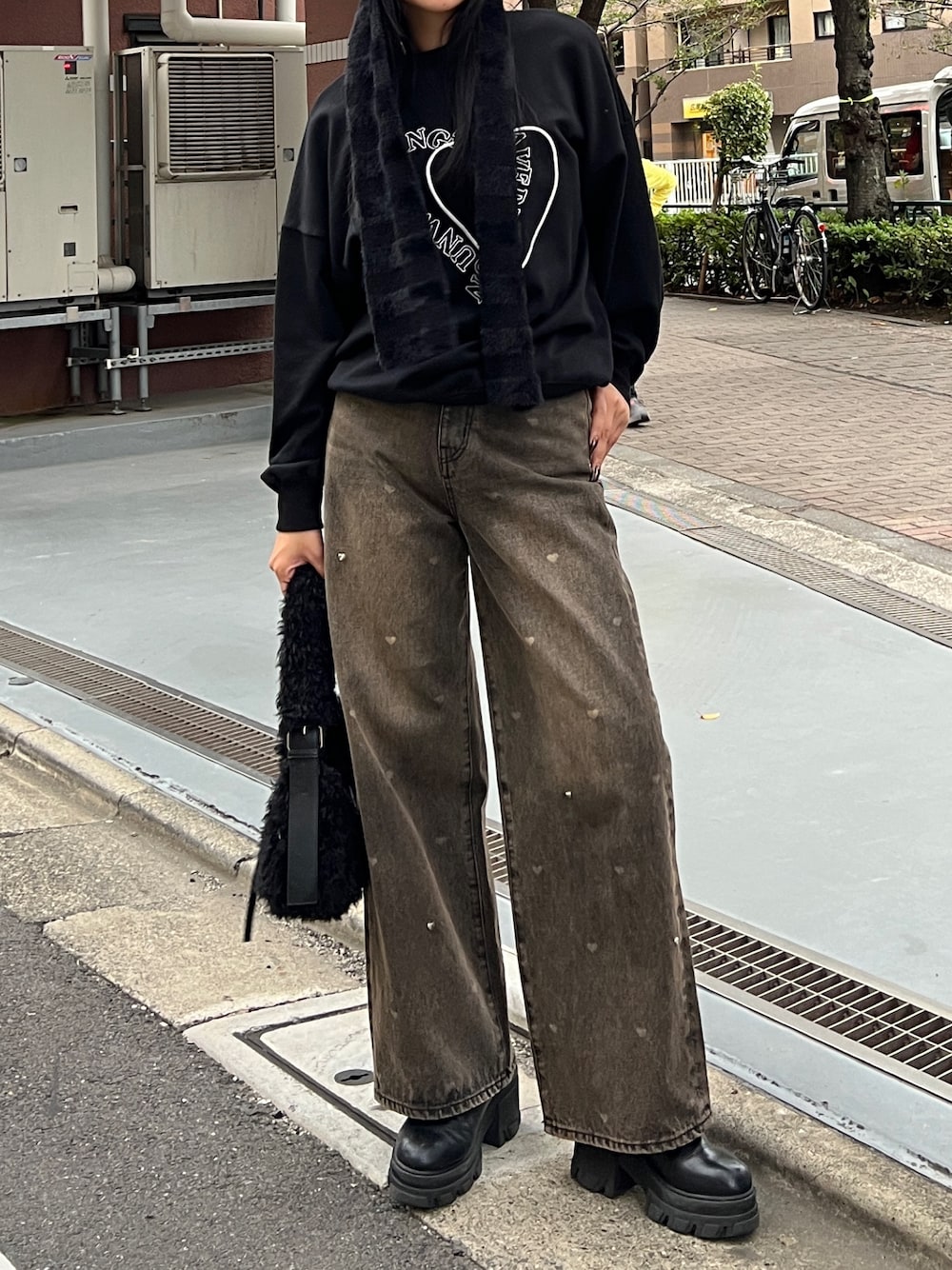 永田真弓(EMODA)のスウェット「ハートロゴオーバースウェットプルオーバー」を使ったコーディネート