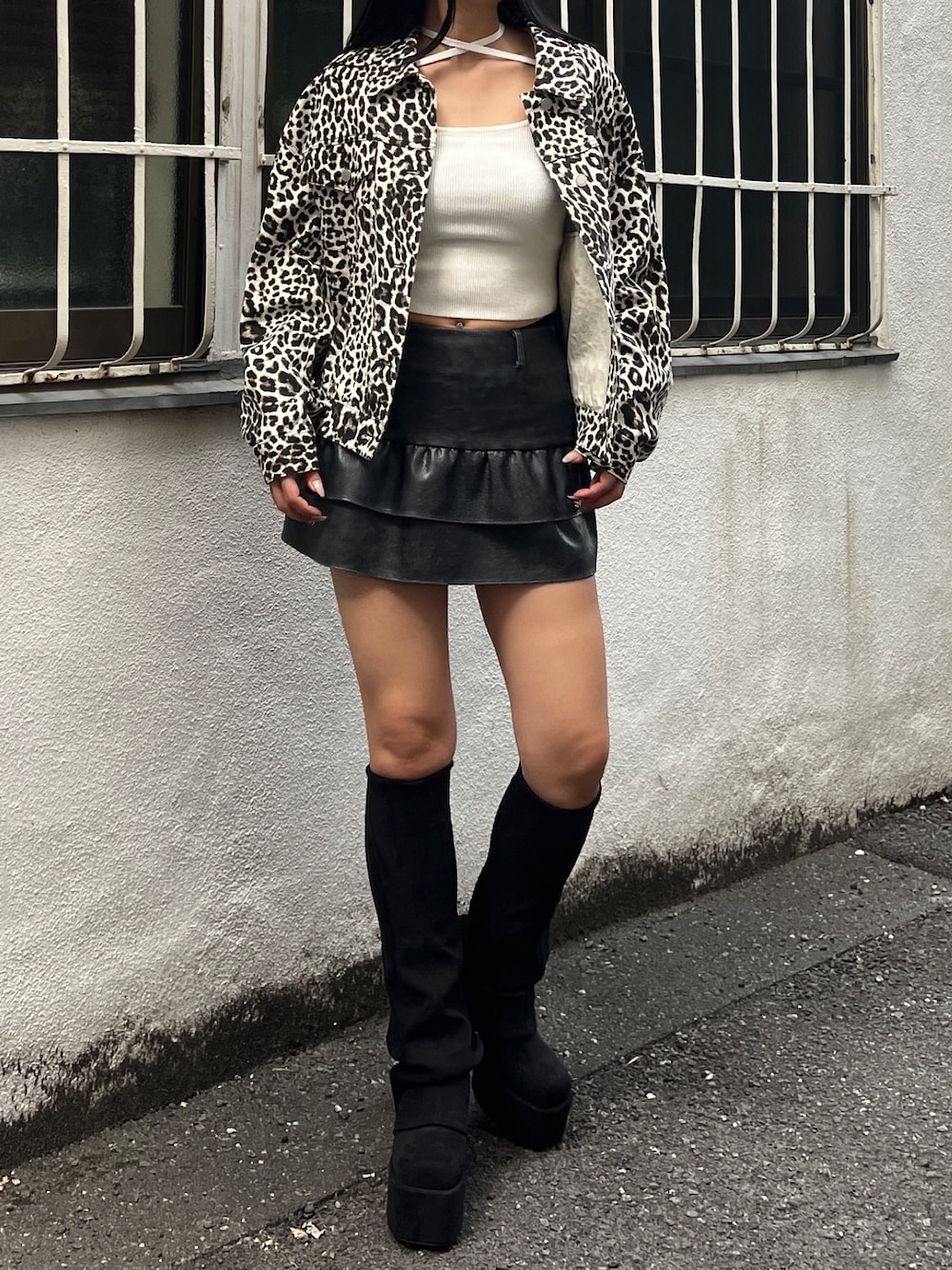 【アウター】 レオパード柄のアウターです! お尻くらいまで丈感あります! 一枚でおしゃれになります! 【トップス】 首元ににチョーカーつけれるトップスです! 紐の部分が取り外し出来るのでボトムスによって変えてもいいです! 【スカート】 インナーパンツ付きのスカートです! フリルの部分が2段になってるので 今ぽくて可愛いです! 【シューズ】 膝下丈のロングブーツ! 今年は、ルーズソックスみたいなくしゅくしゅになってるデザインです! 傾斜もないので、歩きやすいし、軽いです! (普段25.5cm-26cm着用)