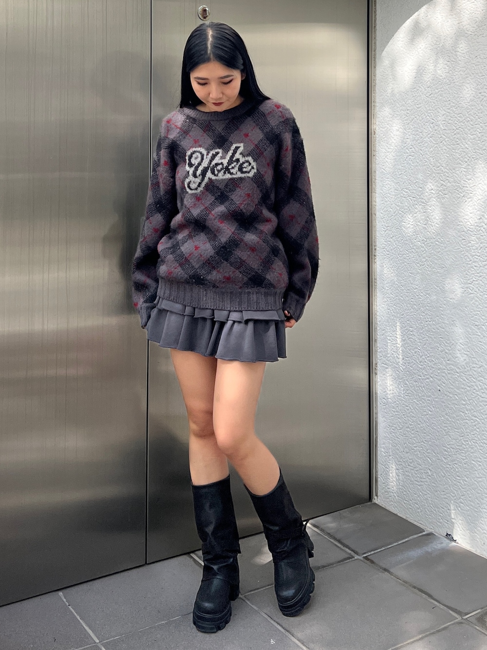 永田真弓(EMODA)のニット/セーター「チェックロゴオーバーニット」を使ったコーディネート