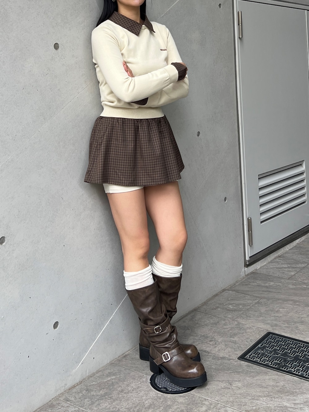 【トップス】 襟がついてるデザインの、トップス! 丈感も長めなのでゆるっと着られます! 【スカート】 トップスとセットアップで着られます! インナーパンツなので、見えないです🫥 【ブーツ】 ローヒールブーツです! 今っぽいベルトループがついてるデザインの ブーツです👢 25.5cm-26cmでLサイズです!