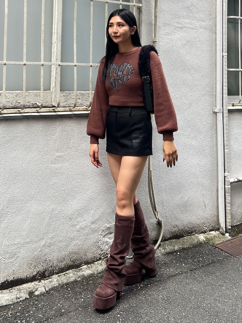 【トップス】 胸元の刺繍がかわいいデザインのニットです! 丈感も長めです!♡ 【スカート】 ハートのデザインが可愛いタイトスカート! インナー付きなので、安心して着やすいです! 【ブーツ】 ルーズソックス風のロングブーツ! 傾斜もなので歩きやすいです! Lサイズ着用!