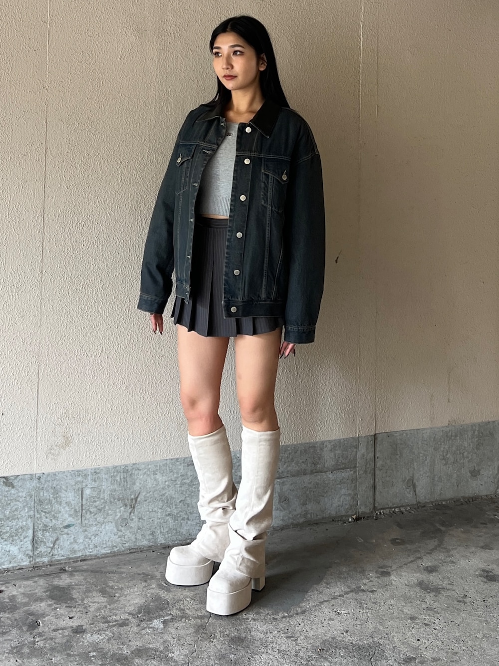 【ジャケット】 オーバーサイズのジージャンです! 裏地がキルティングになってて可愛いです♡ 襟元がレザーなのがポイントです! 【インナー】 シンプルなトップスです! 胸元にチャームがついてて 可愛いです! 【スカート】 インパン付きのプリーツスカートです! 【シューズ】 膝下丈のロングブーツ! 今年は、ルーズソックスみたいなくしゅくしゅになってるデザインです! 傾斜もないので、歩きやすいし、軽いです! (普段25.5cm-26cm着用)