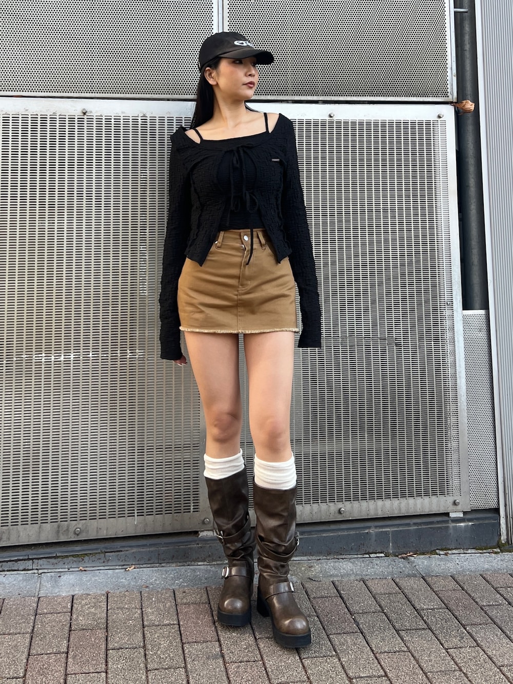 【トップス】 キャミソールと2ピースになってます! フロント部分がリボンで可愛いです♡ 丈感も長めになるので、お腹出したくない方でも着やすいです! 【スカート】 インパンがついてるタイトデニムスカートです!168cmでSサイズ着用♡ 【シューズ】 ベルトデザインが可愛いブーツです!♡ 高さがあまりないデザインなので、 高身長の方でも履きやすいです! (25.5cm-26cmでLサイズ着用)