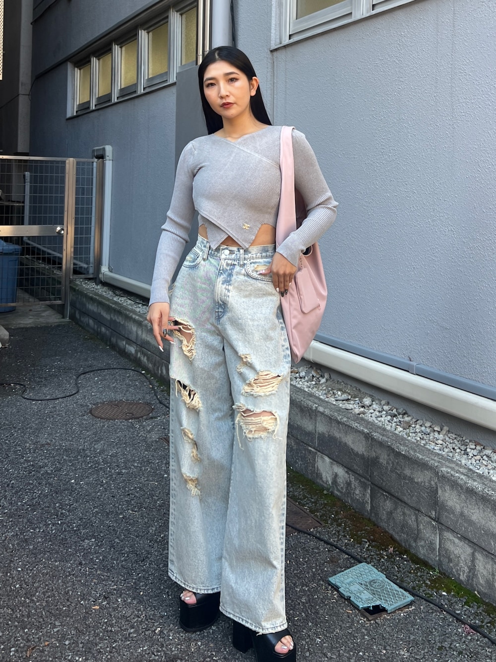 【トップス】 裾がクロスになってるデザインです! ウエストが細く見えます♡ 【デニム】 ダメージが大胆に入ってるデニムです! シンプルなトップスと合わせると 映えます♡ 【シューズ】 EMODAの厚底サンダルは歩きやすいです♡ 高低差がないので疲れないです! Lサイズ着用