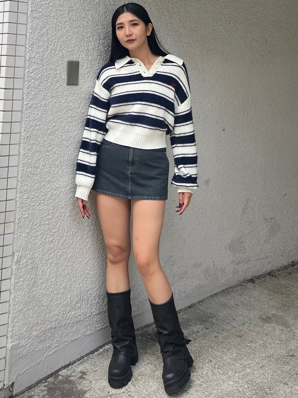 【トップス】 ボーダーニット🧶 ゆるってしてるので着やすいです! 丈感も長めです♡ 【スカート】 デニムのタイトスカートです! インナーパンツついてるので、中見えないようになってます! 【シューズ】 ふくらはぎくらいの丈感のブーツです! クシュってしてるのでイマドキぽいです! (普段25.5cm~26cmでLサイズ着用)