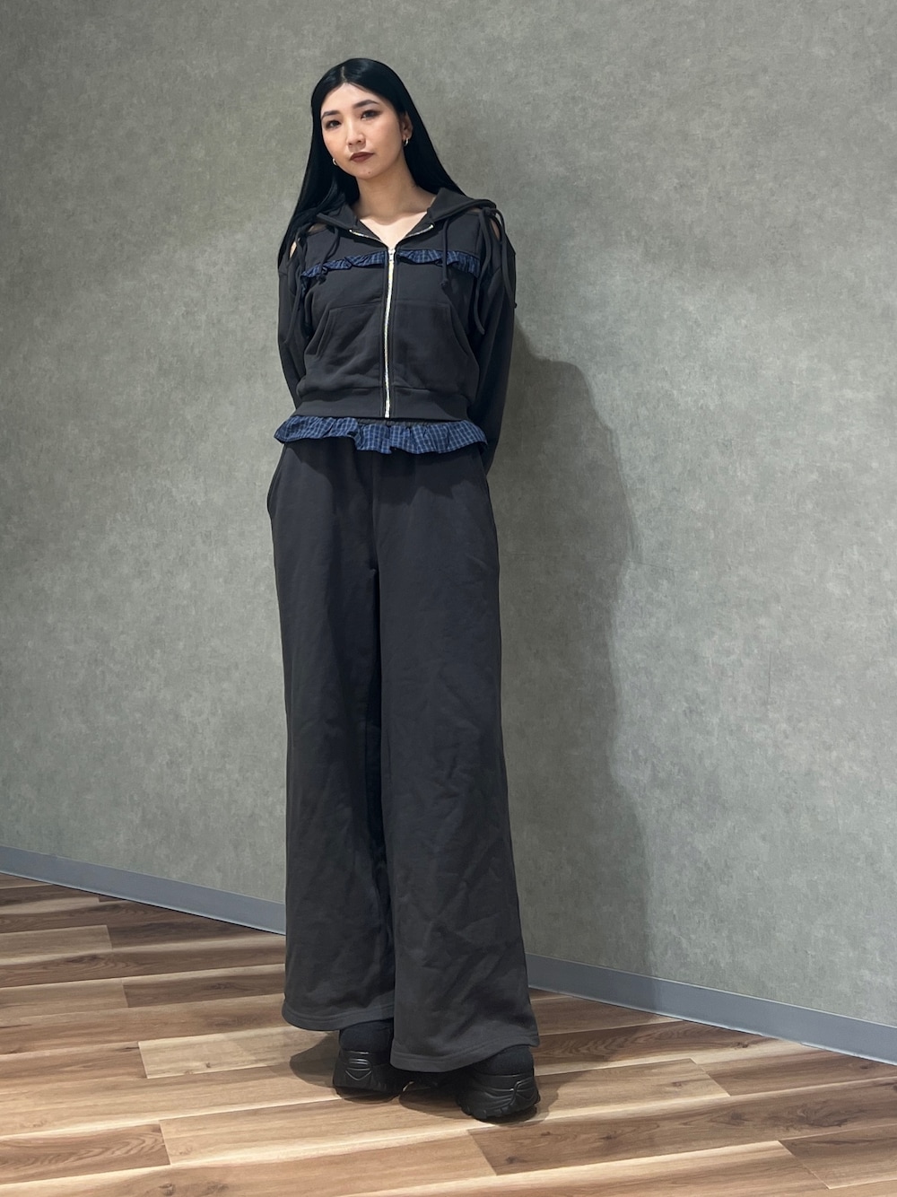 永田真弓(EMODA)のパーカー「カットアウトリボンフーディ」を使ったコーディネート