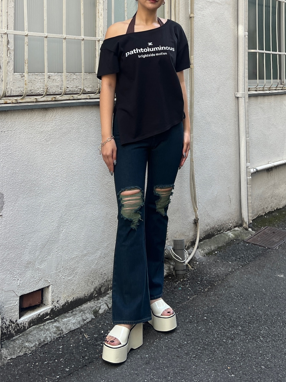 【トップス】 ワンショルダーのデザインが可愛いTシャツです! インナーのカップ付きが可愛いです☘️ 【デニム】 膝下のダメージが可愛いのがポイント❤️ スタイルが綺麗に見えます! 【シューズ】 高低差がないので一日中歩いてても疲れないです🫣(普段25.5cm~26cmでLサイズ着用)