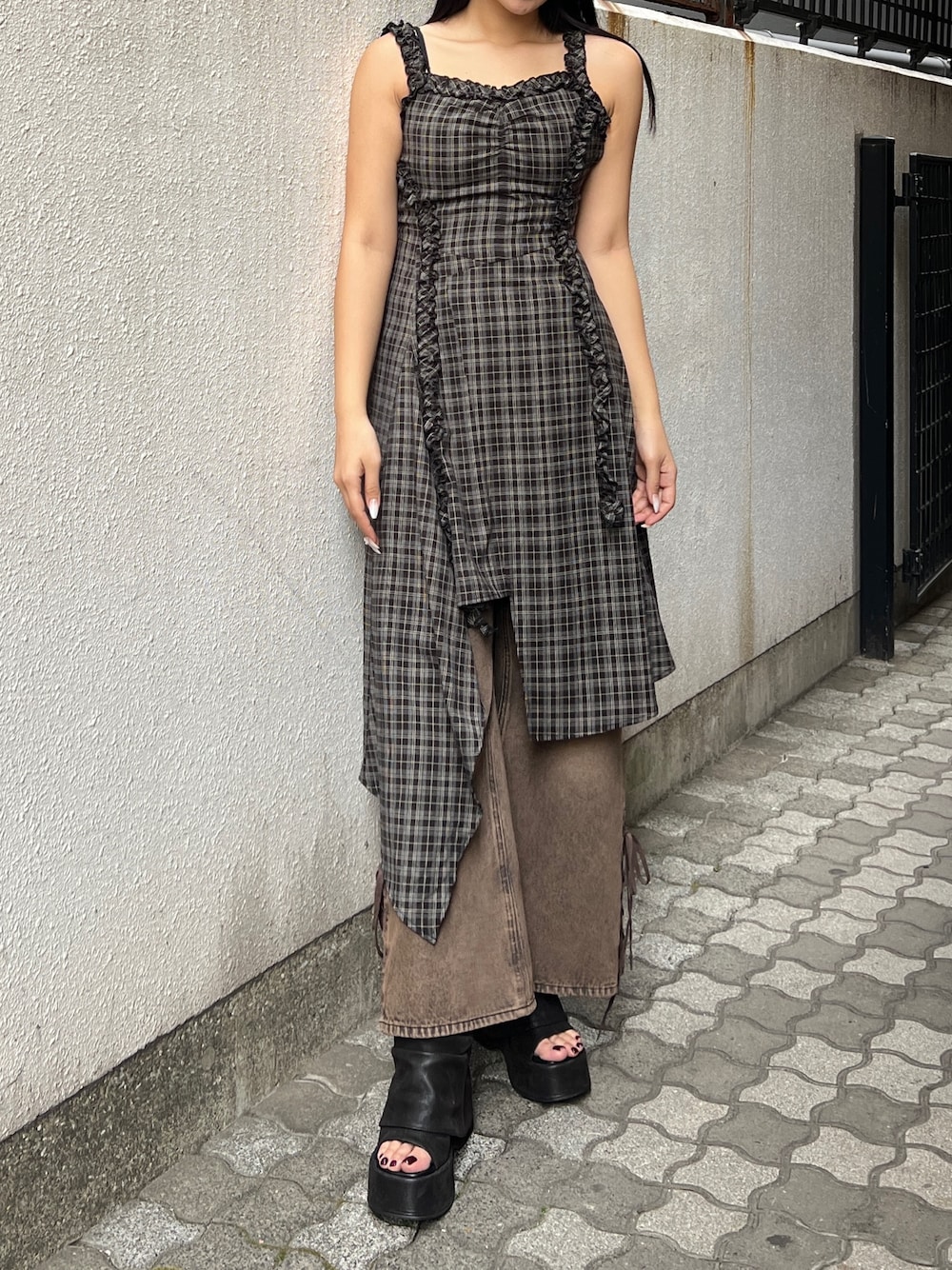 【ワンピース】 チェック柄が大胆で可愛いです! ストライプがレースなのがポイント! 【ワイドデニム】 足が8割に見えるのがワイドデニムです⭐︎ 裾にレースがついてるのでカワイイ 【シューズ】 フラットしてる厚底です! ふくらはぎくらいまであるので盛れる (普段25.5cm~26cmでLサイズ着用)