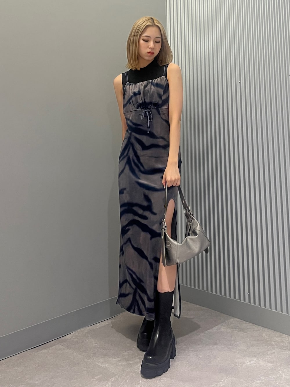 【ベロアワンピースコーデ🤍】 [トップス]ノースリーブで薄めの素材なので夏は1枚で、秋はジャケットやブルゾンのインナーとしても着回し抜群ハイネックトップス✨シンプルなデザインが使いやすい🫶🏼 [ワンピース]ベロア素材でスリットが入っている秋先取りキャミワンピース🍂肌触りが良く、腰の切り替え位置が高めなので脚長効果抜群✨インナーにシアートップスや薄めのリブニットを合わせて秋まで長く使えます🙋🏼♀️ [ブーツ]高さ8.5cmの毎年大人気厚底サイドゴアブーツ👢横幅広めの私でも窮屈感なく、すっごく軽いので歩きやすさ抜群✨さりげなく盛りたい高身長さんにもオススメ🖐🏼前から見ても横から見ても足首のラインが細く見えるので他のサイドゴアブーツは履けなくなります👀