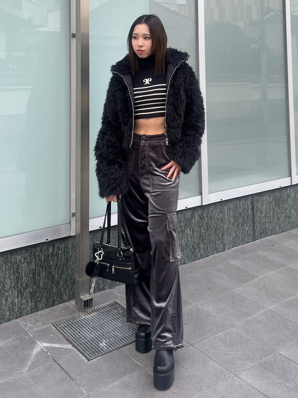 【モノトーン冬っぽコーデ🖤】 [アウター]店頭でも大人気なボリュームたっぷりボアブルゾン❤️ショート丈なのでバランスが取りやすく襟は上まで上げると首までしっかりあるのでとても暖かくマフラーなしで◎袖口は中がリブ素材で風を通さないのでしっかり防寒できます👀 [トップス]クロップ丈のハイネックニット🩶タイトめで身長160cmの私であばら骨くらいの短さ✨ハイウエストのボトムス合わせでスタイルアップ🙆🏼♀️リボンのワンポイントとボーダーのデザインが綺麗めに見せてくれる大人っぽいニット🎀 [パンツ]ベロア素材のアウトポケットベロアパンツ💕身長160cmでSサイズ着用🙋🏼♀️ゆったりめなシルエットで楽ちんなのにお洒落感をしっかり出せるのがおすすめ👀裾は絞ってもストレートでも着られるので雰囲気によって変えられます✨ [ブーツ]厚底11cmの安定感抜群激盛れブーツ🖤取り外しが簡単なベルト付きのヴィンテージデザインが可愛い💭ベルトをはずすとシンプルなブーツとしても履けるのが🙆🏼♀️ [バッグ]チャーム付きのスクエアショルダーバッグ🩶長めのショルダーストラップになっていて中身は沢山入るマチ付き大容量で荷物が多くても使いやすい🙆🏼♀️❤️ファーやチェーンのストラップは取り外し可で雰囲気によって変えられます✨