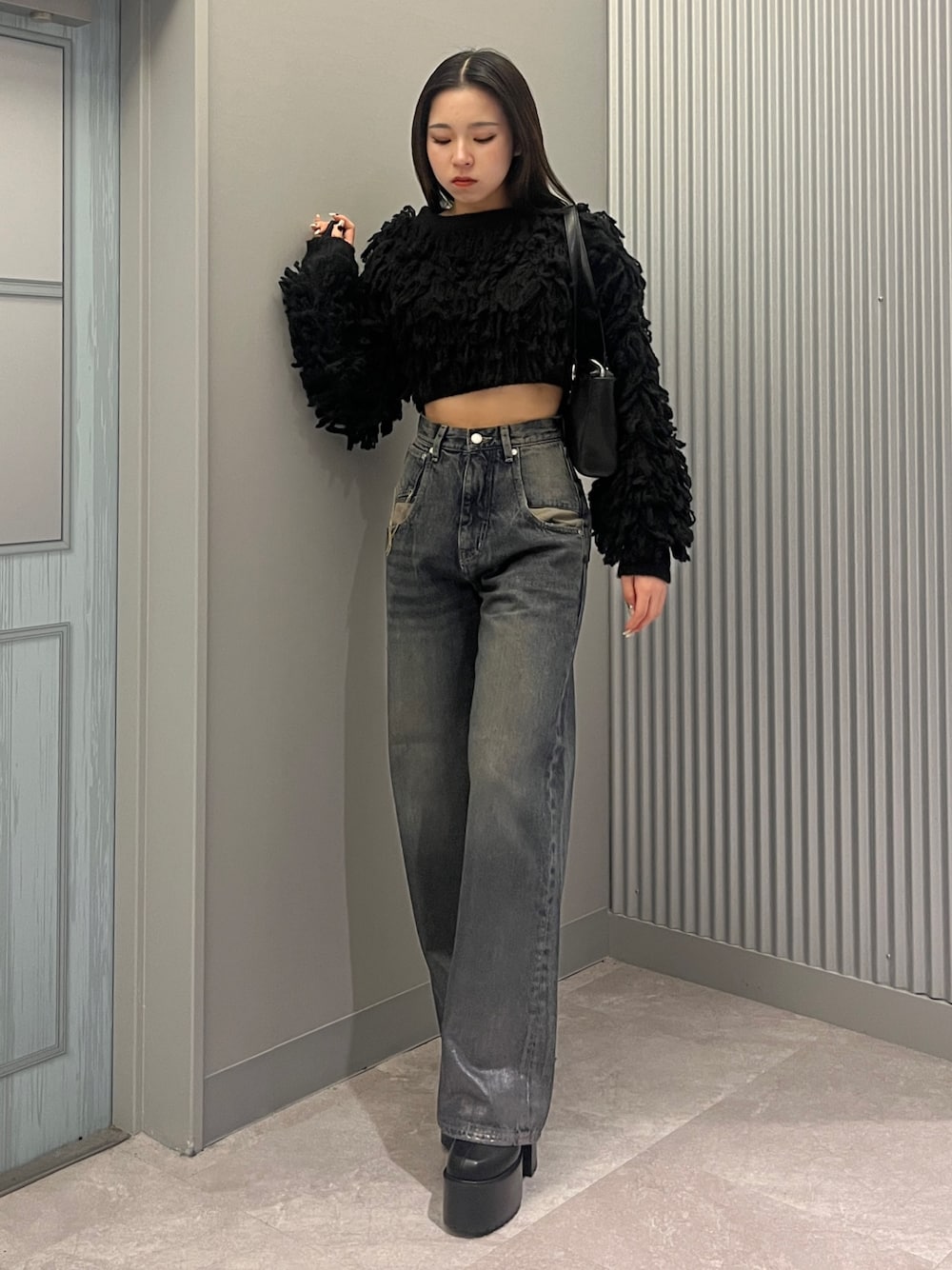 【モケモケニットのデニムコーデ🖤🖤】 [トップス]毛足長めのショート丈フリンジニット🩶生地感柔らかくチクチク感ゼロで丈感短めなのでハイウエストと合わせてお洒落感見え👀 [デニム]身長160cmでSサイズ着用🖐🏼ハイウエストでストレートなシルエットなので脚長効果抜群✨裾にかけてグラデーションで裾にかけてキラキラしてるので人と被らないデザインがおすすめ🩶 [ブーツ]厚底11cmの安定感抜群激盛れブーツ🖤取り外しが簡単なベルト付きのヴィンテージデザインが可愛い💭ベルトをはずすとシンプルなブーツとしても履けるのが🙆🏼♀️24.5cmでLサイズ着用 [バッグ]チャーム付きのスクエアショルダーバッグ🩶長めのショルダーストラップになっていて中身は沢山入るマチ付き大容量で荷物が多くても使いやすい🙆🏼♀️❤️ファーやチェーンのストラップは取り外し可で雰囲気によって変えられます✨