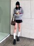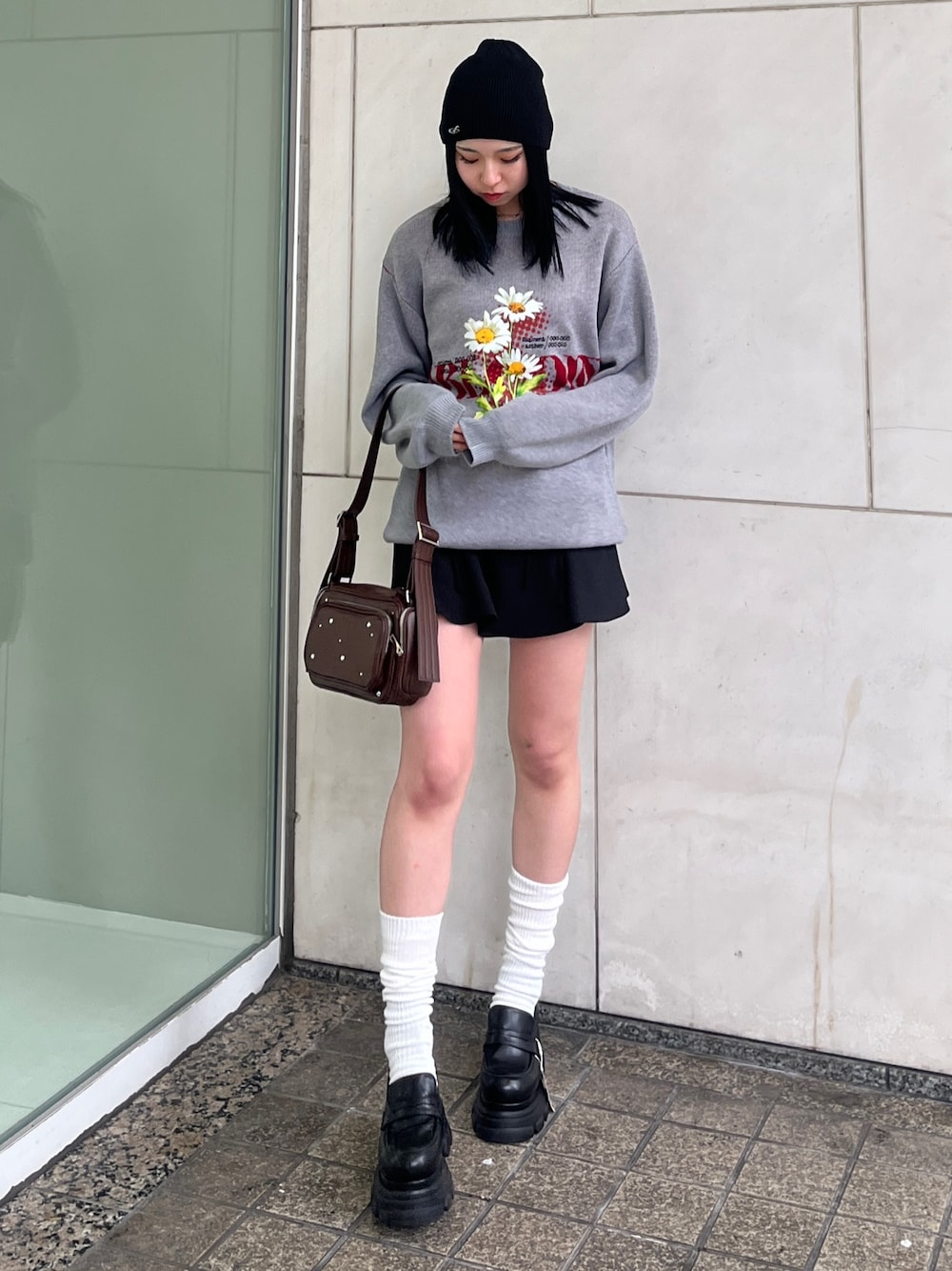 [トップス]160cmの私でお尻が隠れる丈感のオーバーサイズのフラワープリント付きルーズニット🌼生地感も柔らかく、一枚でサラッと着られます🩵 [スカート]160cmでSサイズ着用🖐🏼リボンとギャザーのデザイン付きで裾に動きがあるので細見え◎短めな作りなのでミニ丈好きな方はオススメ✨ [バッグ]ビジュー付きスクエアバッグ👜コンパクトサイズ感なのにしっかりマチ付きなので大容量✨ [ローファー]厚底8.5cmの激盛れローファー👀24.5cmでLサイズ着用🖐🏼厚底ローファーなのに安定感抜群でとても軽量でしっかり歩きやすい💜