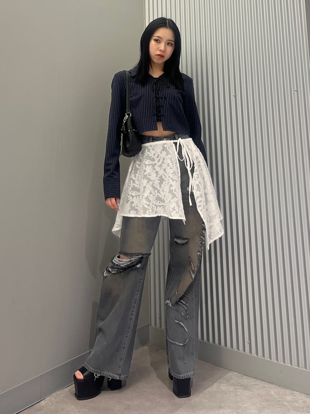 [トップス]フロント部分が紐で絞れるデザインシャツ💙ショート丈でウエスト部分も細見え✨生地感が柔らかめなのでかっちりしすぎないシルエットがカジュアルコーデに合わせやすい🖐🏼 [スカート]レースの巻きスカートでデニムに巻いてもスカートの上から重ねてもコーデのワンポイントに❤️ [デニム]身長160cmでSサイズ着用🖐🏼ずるっと履けるワイドジーンズで厚底で合わせても丈感は長めがポイント👀さりげなくクラッシュ加工が施されているのでシンプルコーデにもアクセントになります💙 [サンダル]厚底14.5cmの激盛れサンダル💜毎年人気サンダルが更に軽く✨全体的な高低差がなく、安定感抜群なのに疲れにくいのがポイント👀足首のストラップで3段階調節も可なのでジャストサイズで履いていただけます🪽24.5cmでMサイズ着用🩵