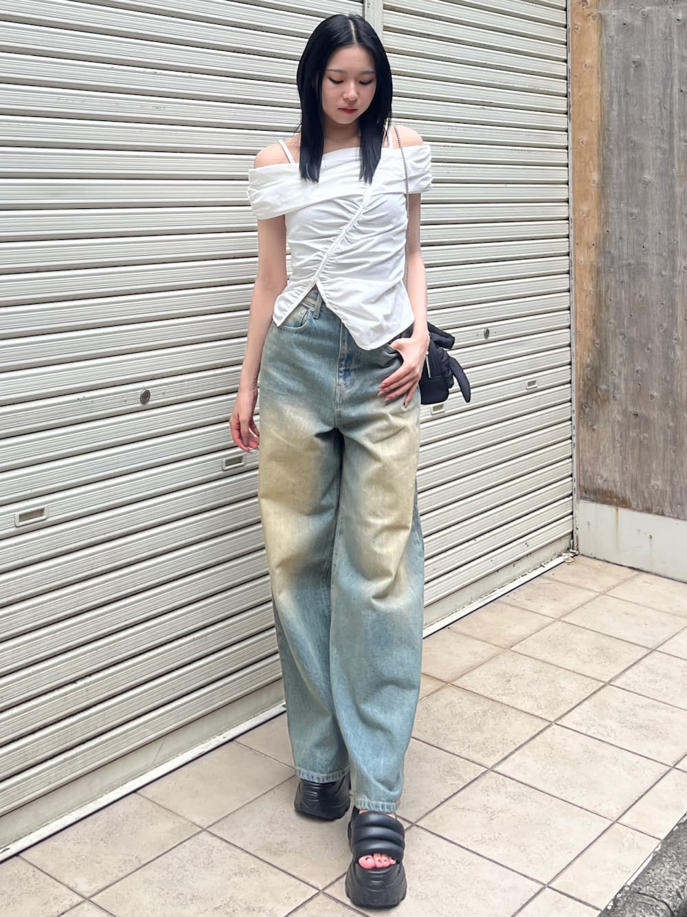 [トップス]ウエストラインが綺麗に見えるオフショルダートップス🤍肩周りにボリューム感があり腕の細見え効果抜群✨丈は短すぎないのでミニスカート合わせでもデニムコーデも🙆🏼♀️ [デニム]身長160cmでSサイズ着用🖐🏼腰回りはしまって見えるのに裾にかけてゆったりしているワイドデニム🩷ストレートよりかはワイドめなシルエットでミュールやスニーカー合わせもおススメ💭 [サンダル]厚底10cmのクッション性抜群のスポーツサンダル🍒マジックテープで着脱しやすく足にフィットしてくれるのでスニーカーを履いてるような楽ちんな履き心地✨24.5cmでMサイズ着用💙 [バッグ]リボンの結びデザインが可愛いショルダーバッグ👜ミニサイズでアクセサリー感覚でかけられる💙