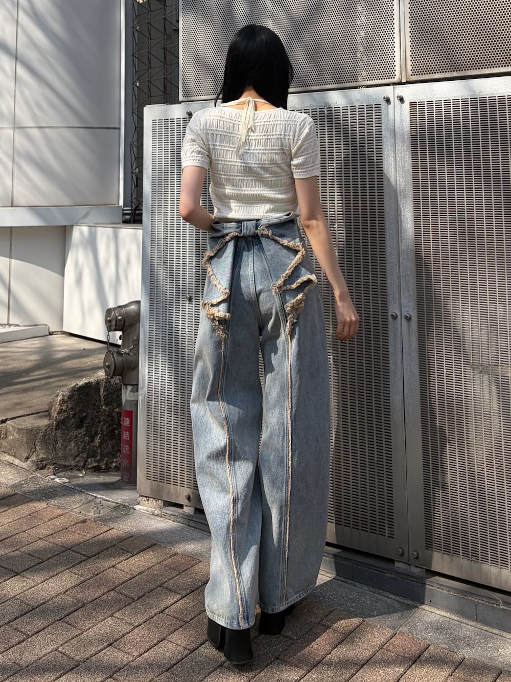 [デニム]予約殺到中‼︎大胆なバックリボンがアクセントのワイドルーズジーンズ🎀身長161cmでSサイズ着用🍒ウエストは引き締まっているのに裾はゆったり履けるのでシルエット優勝✨ ボリュームたっぷりなのでトップスはタイトスタイルが◎