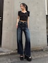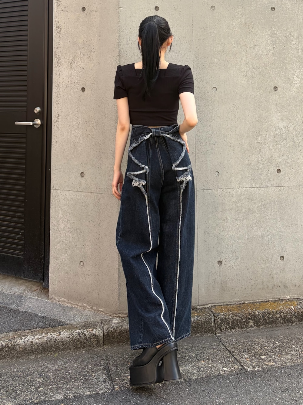 [デニム]予約殺到中!!大胆なバックリボンがアクセントのワイドルーズジーンズ🎀身長161cmでSサイズ着用🍒ウエストは引き締まっているのに裾はゆったり履けるのでシルエット優勝✨ボリュームたっぷりなのでトップスはタイトスタイルが◎