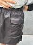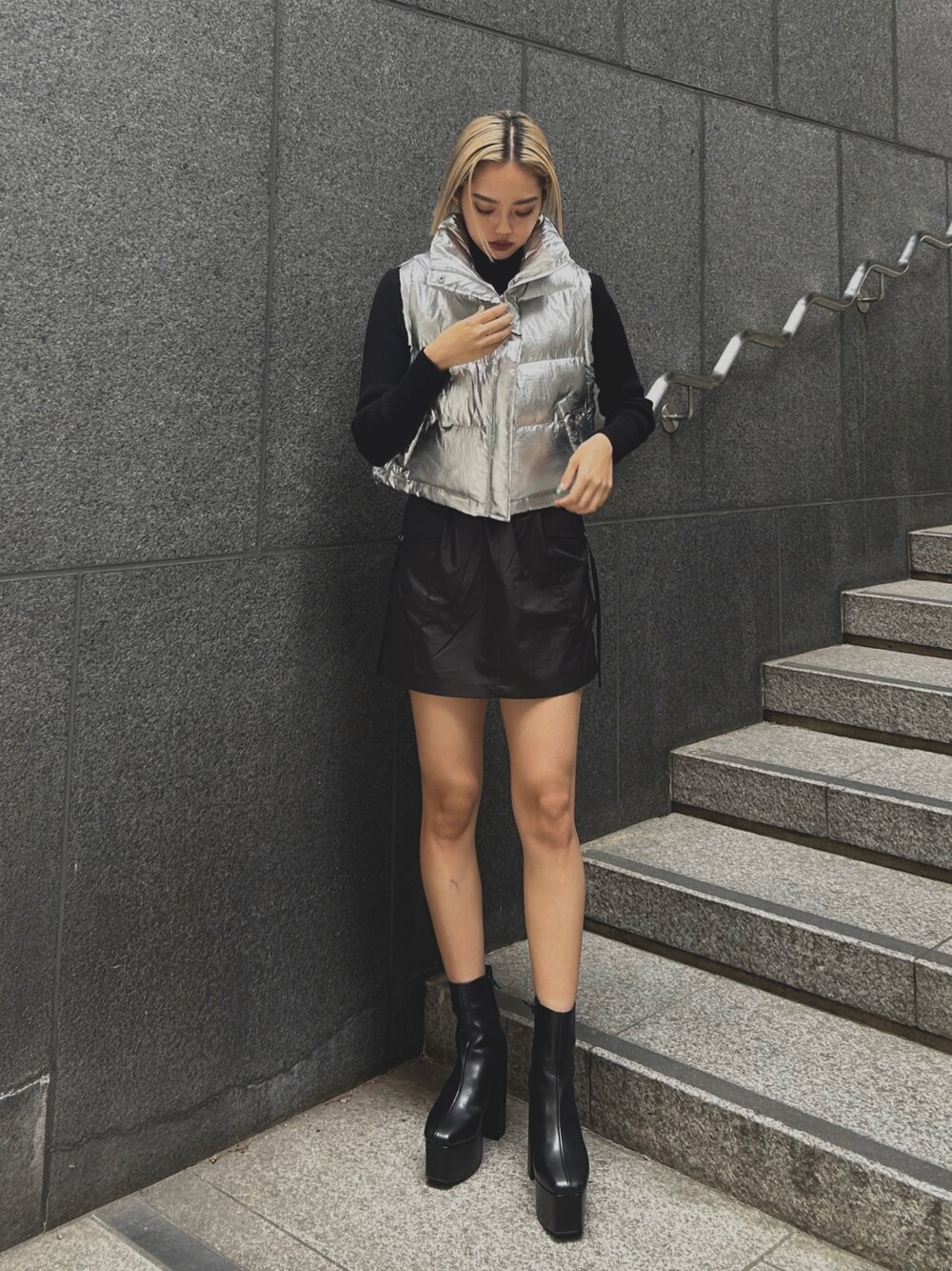 ダウンベストはとても軽いです!袖口が広めのつくりなので、分厚めのトップスとも合わせやすいです✨ カーゴデザインのスカートはインナーパンツ付きなのでミニ丈でも安心して履いていただけます👍🏻 ブーツは普段24cmでLサイズ着用しています。ヒールが12cmありますが、高低差がないので安定していて歩きやすいです! 履くだけで足盛れます😎🖤