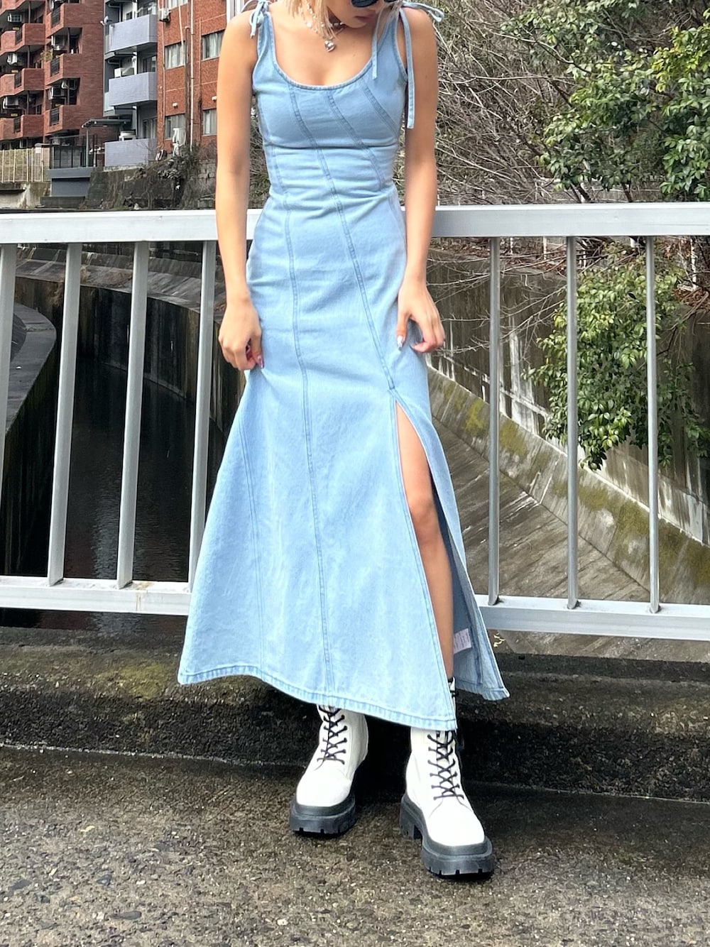 MINAMI(EVRIS)のワンピース「ステッチデザインデニムロングキャミワンピース」を使ったコーディネート