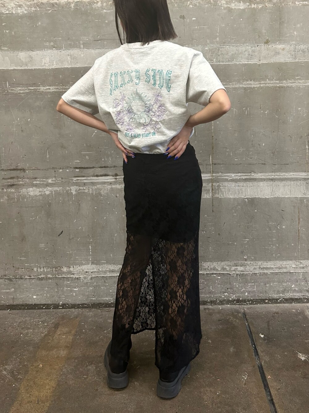 Tシャツはワンピース風でも着れるぐらいの丈感です! トレンドのレースのスカート🖤ショート丈でもオーバーサイズのトップスでも合わせやすいです🪄
