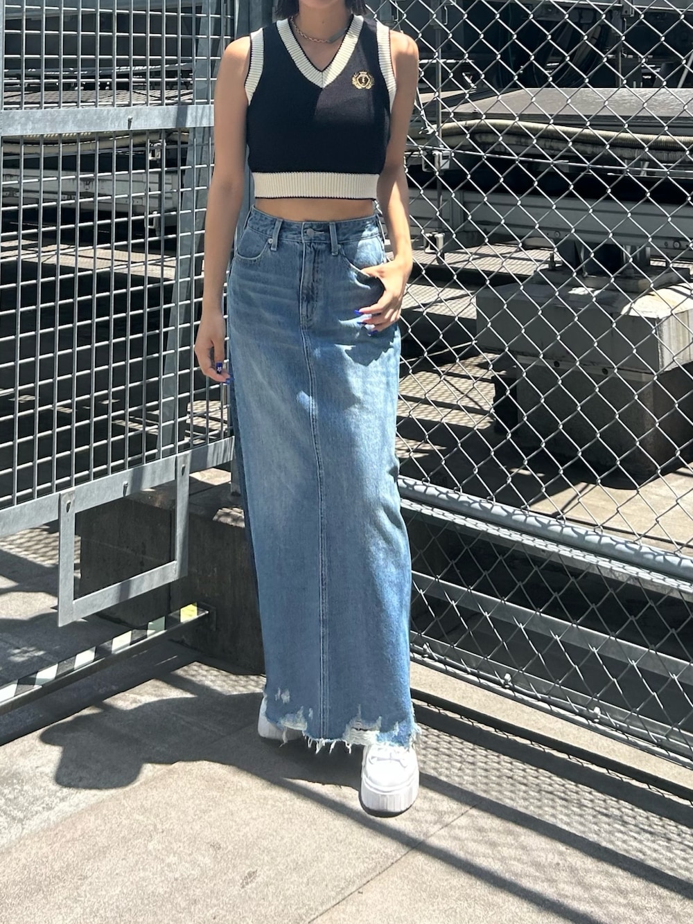 MINAMI(EVRIS)のデニムスカート「リメイクデザインロングデニムスカート」を使ったコーディネート