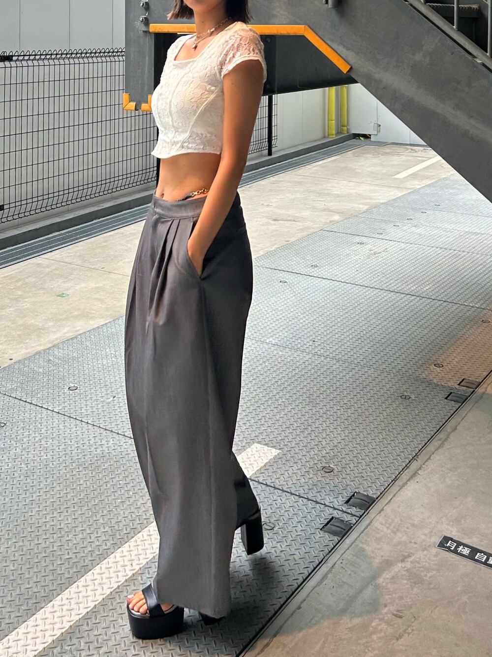 トレンドのレーストップス🤍 パンツは163cmでMサイズでゆるっと履いてます!チェーンは取り外し可能です! サンダルは普段24cmでMサイズでピッタリでした!
