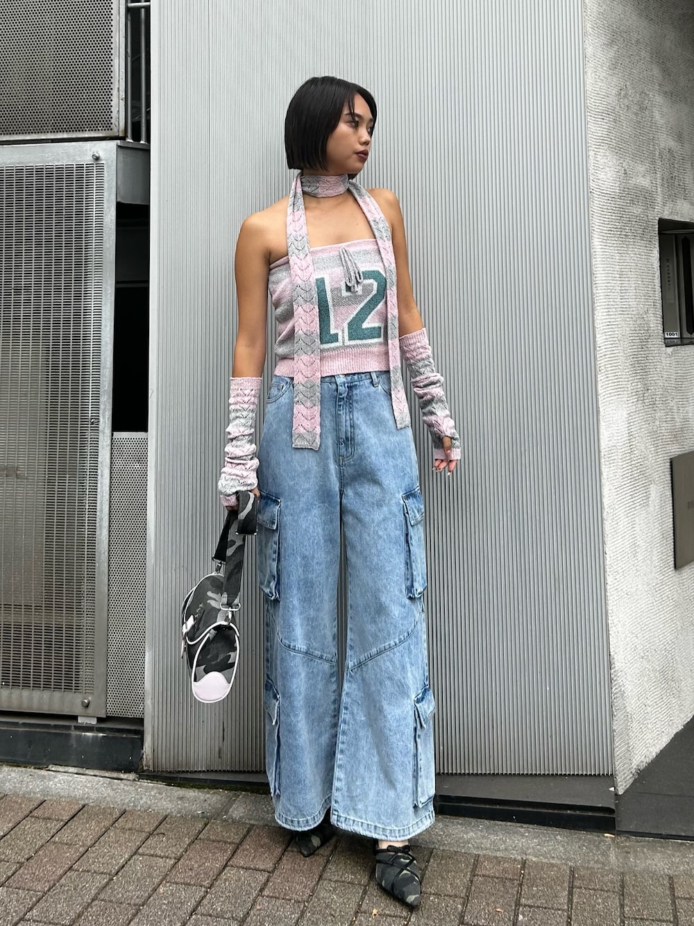 トップスはチョーカーとアームウォーマーもセットで付いてます🎀ビスチェはずれ落ちてこないです👍🏻デニムは裾にアジャスターがついていてお好きなシルエットに調節していただけます!バッグはコンパクトなサイズですがマチがしっかりあるので荷物もちゃんと入ります🙆♀️シューズはクッションがしっかりしていて歩きやすいです!