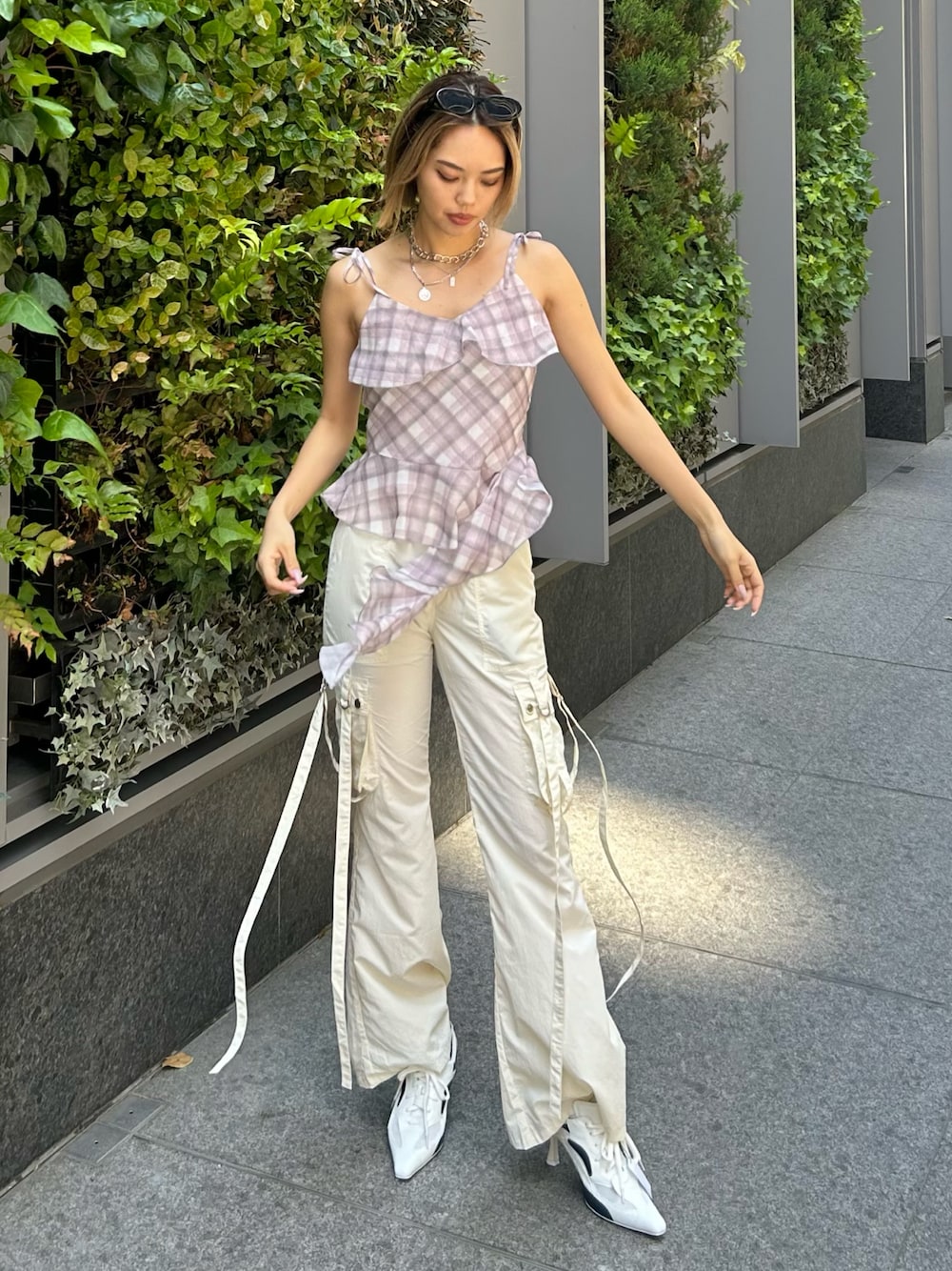 トップスは肩紐で長さの調整が可能です🎀シフォン素材で暑い夏にもぴったり! パンツは163cmでSサイズ履いてます!裏地が付いているので下着は透けにくいです✨ シューズは普段24cmでLサイズ履いてます!