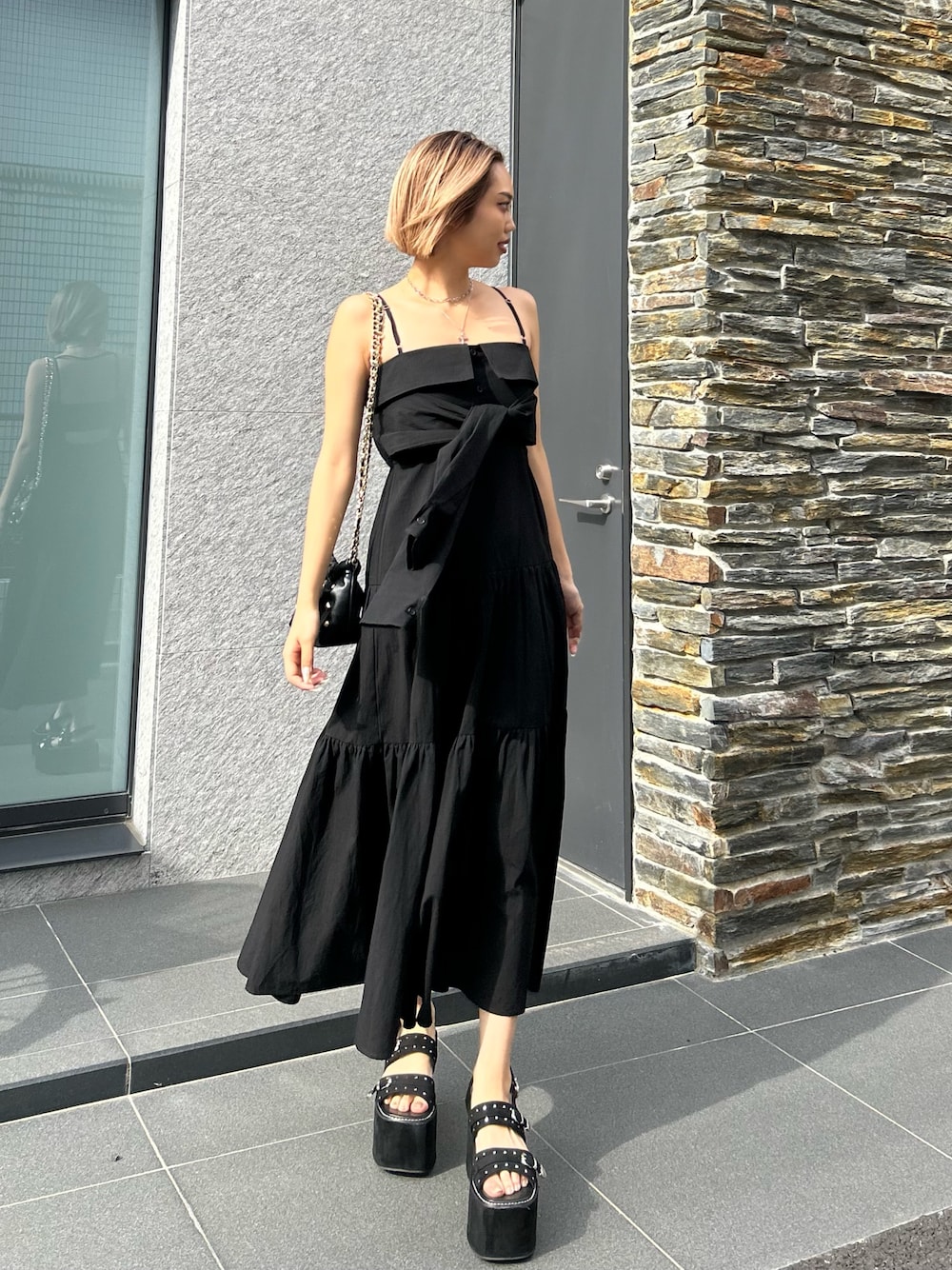 モノトーンコーデ🖤 ワンピースのインナーはチューブトップを着用してます! サンダルは普段24cmでLサイズ履いてます!安定感のある厚底サンダルで歩きやすいです✨ バッグはコンパクトなサイズ感でミニ財布やリップなどの小物が入る大きさになってます🎀