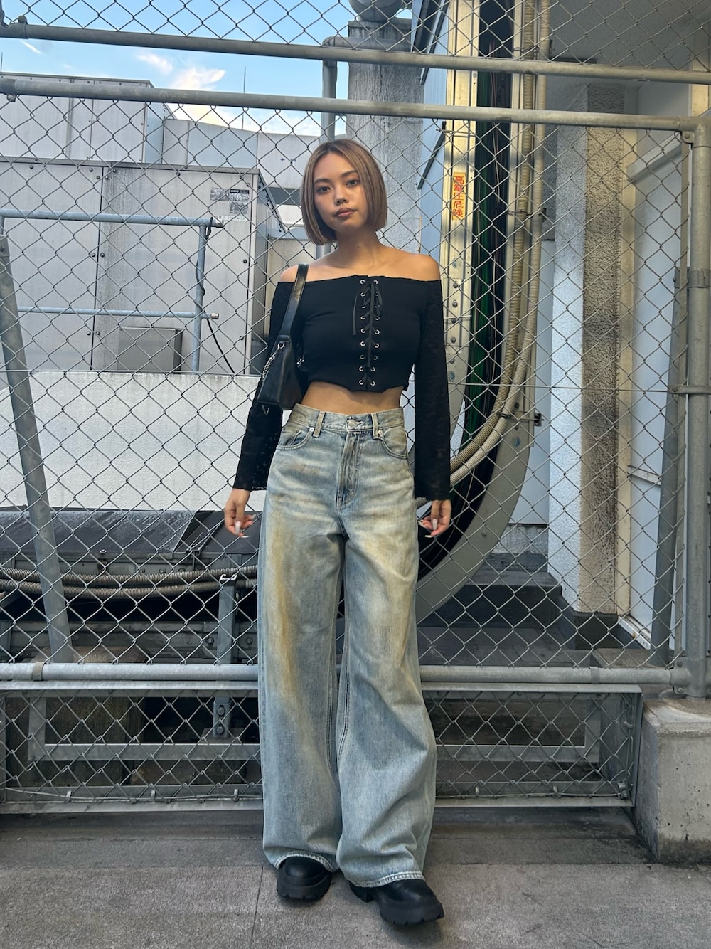 トレンドのレーストップス🫶🏻ぴたっとするのでズレたりせず着やすいオフショルトップスです✨✨ デニムは163cmでMサイズ履いてます!ジャストサイズで履かれたい方はSサイズがおすすめです☺️ ブーツは普段24cmでLサイズ履いてます!