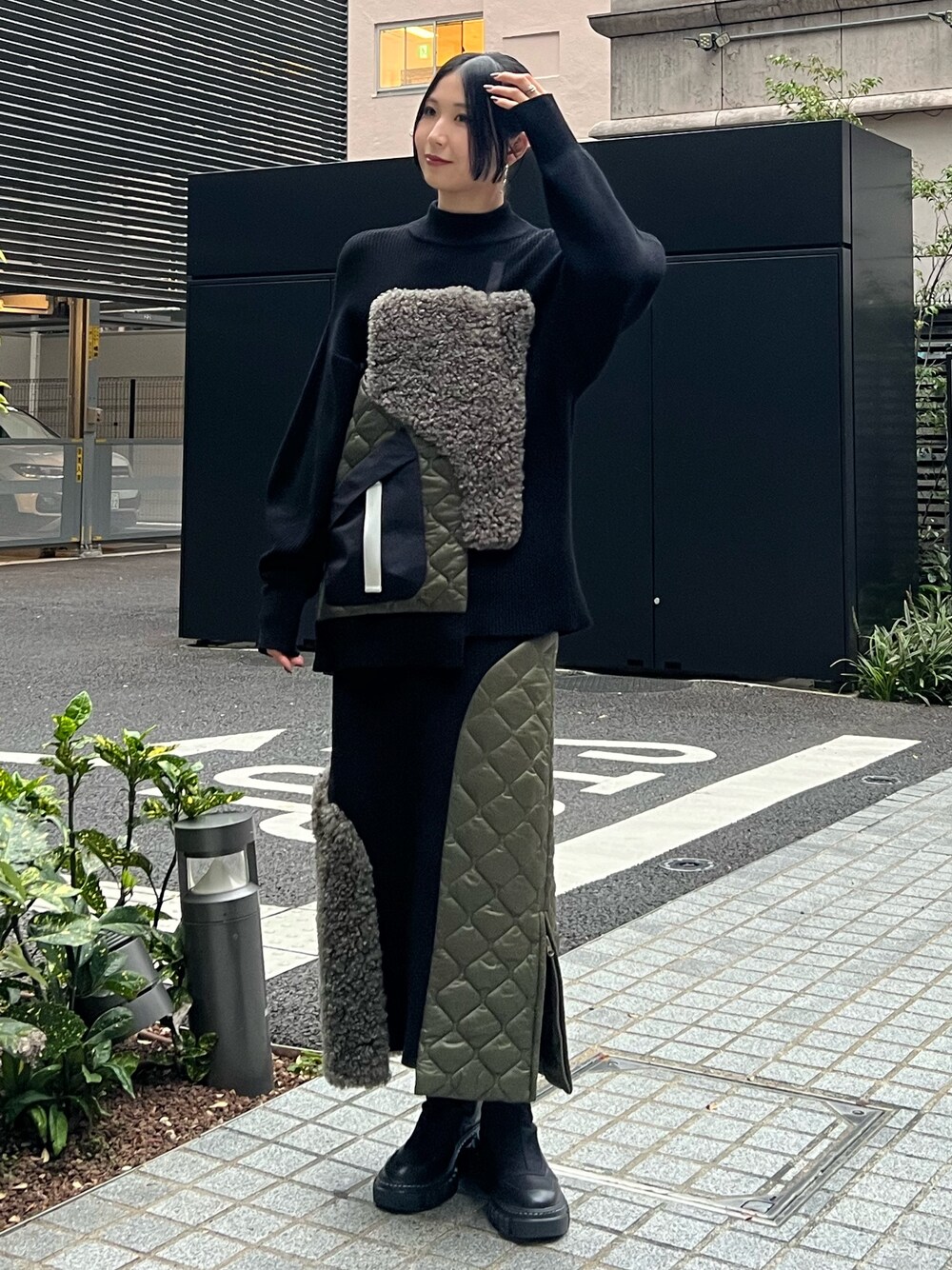 RINKA(UN3D.)のニット/セーター「FABRIC MIX KNIT TOP / ファブリックミックスニットトップ」を使ったコーディネート