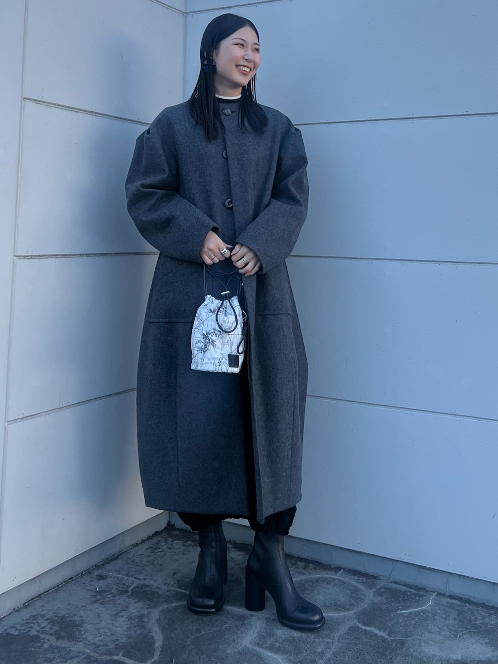 【outer】 ショルダータックがポイントのロングコート。 ウールなのでとても暖かいです! コクーンシルエットになっておりフェミニンな印象ですが、小物合わせによってモードにもなります。