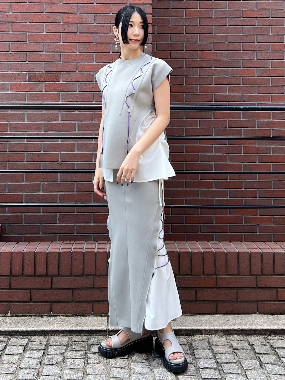 RINKA(UN3D.)のニット/セーター「WAVE CODE KNIT TOPS【セットアップ着用可能】 / ウェーブコードニットトップス」を使ったコーディネート