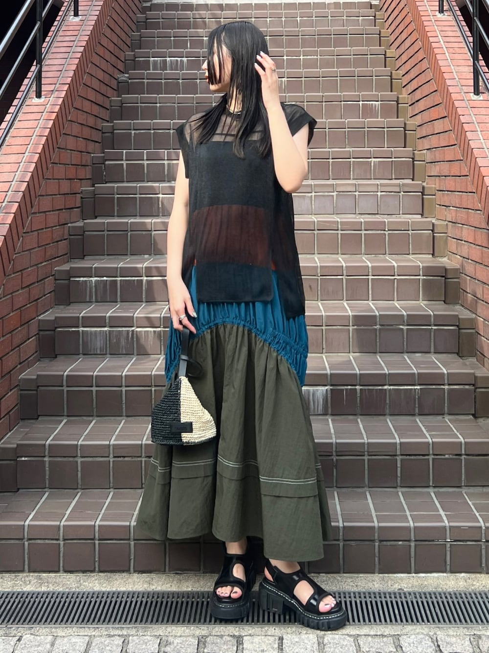 【tops】 重ね着にぴったりのシアーベスト。 肌見せが苦手な方でも絶妙に二の腕を隠してくれるので挑戦しやすいです! ワンピースの上やTシャツの上にレイヤードするのもおすすめ◎ 【dress】 ギャザーがたっぷりのワンピース。 切り替えがアーチを描いているので可愛らしすぎず、程よいモード感があります! アシンメトリーにポイントギャザーも入っていて360度どこからみても可愛いデザイン!夏らしい軽い生地で一枚でもサラッとお出かけできます🌻
