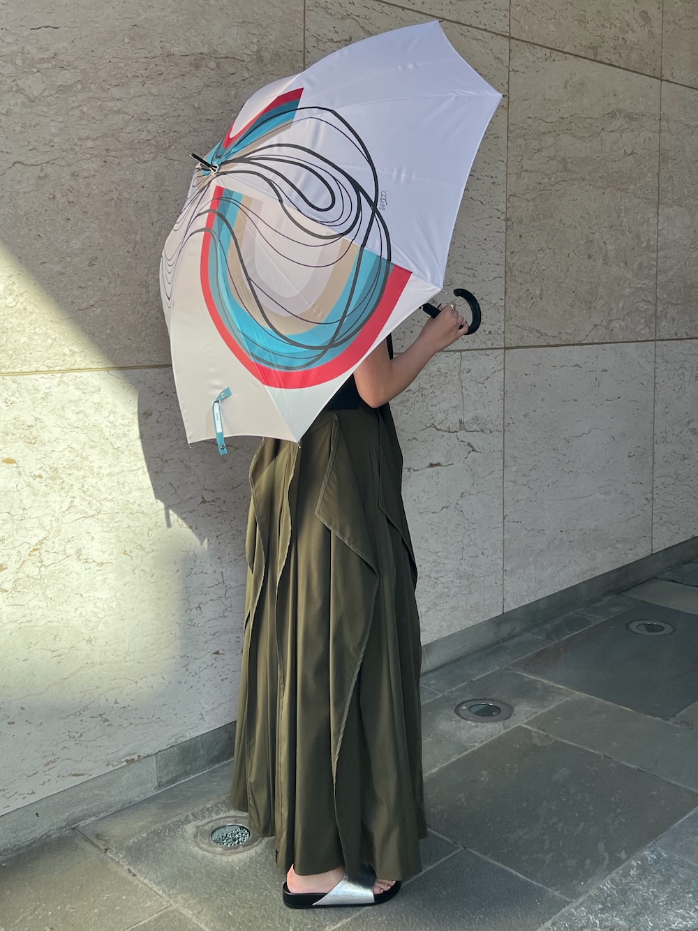 雨の日でもテンションが上がるオリジナル柄プリントの傘。今年は地層をイメージしたモチーフが大きくプリントされています! ニットは肌見せに抵抗がある方でも涼しく華やかなコーデに変えることができるおすすめアイテムです。