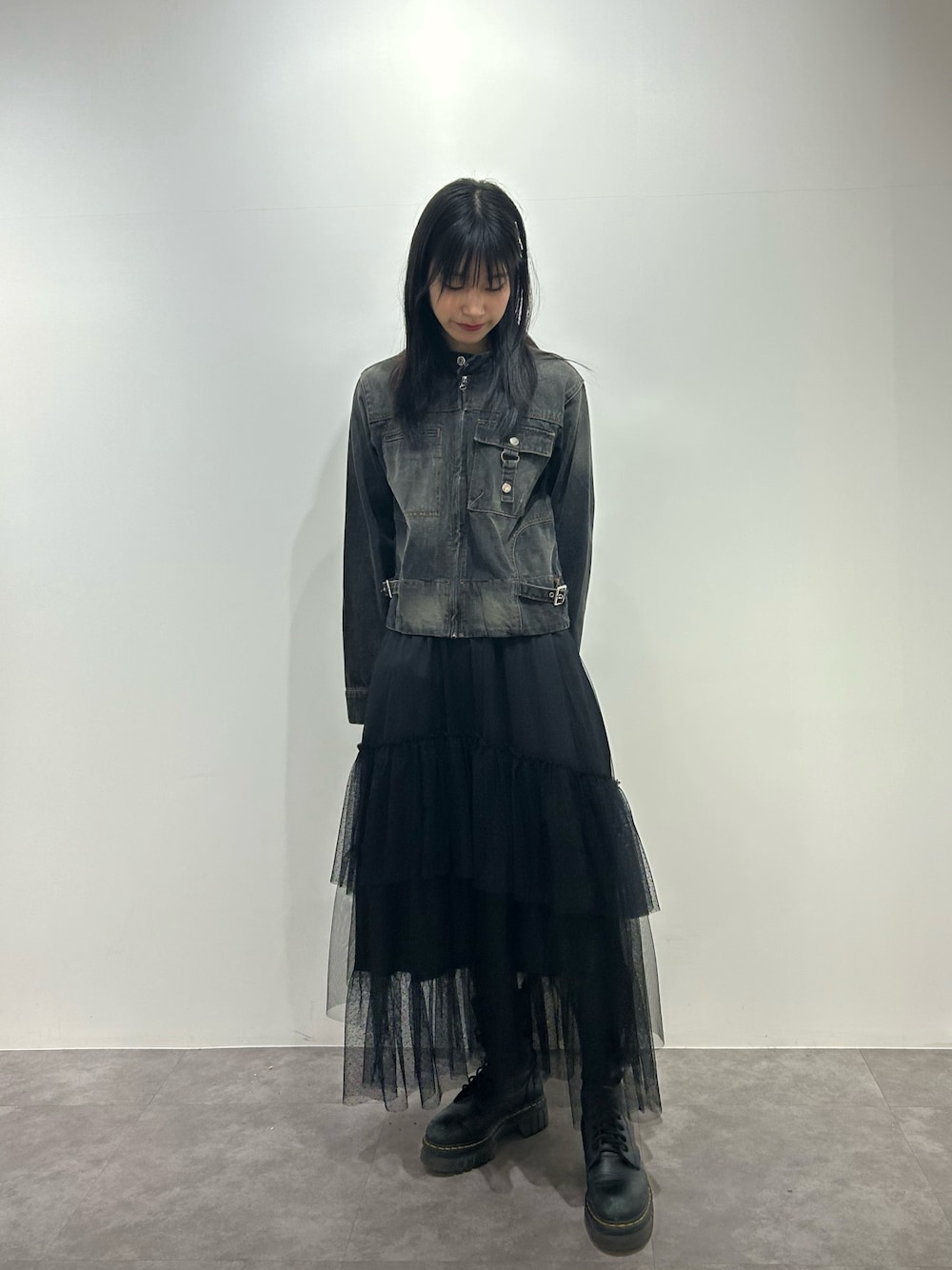 ジャケット 絶対使える定番デニムジャケットは 珍しいタイト目が被らない! すっきりして見えるからフレアスカート合わせにも◎ スカート 黒でも春っぽいチュールで重たく見えない! 重たく見えないけど甘すぎないからストリート派さんにも挑戦しやすいです! 163センチでこのくらいの丈間です!